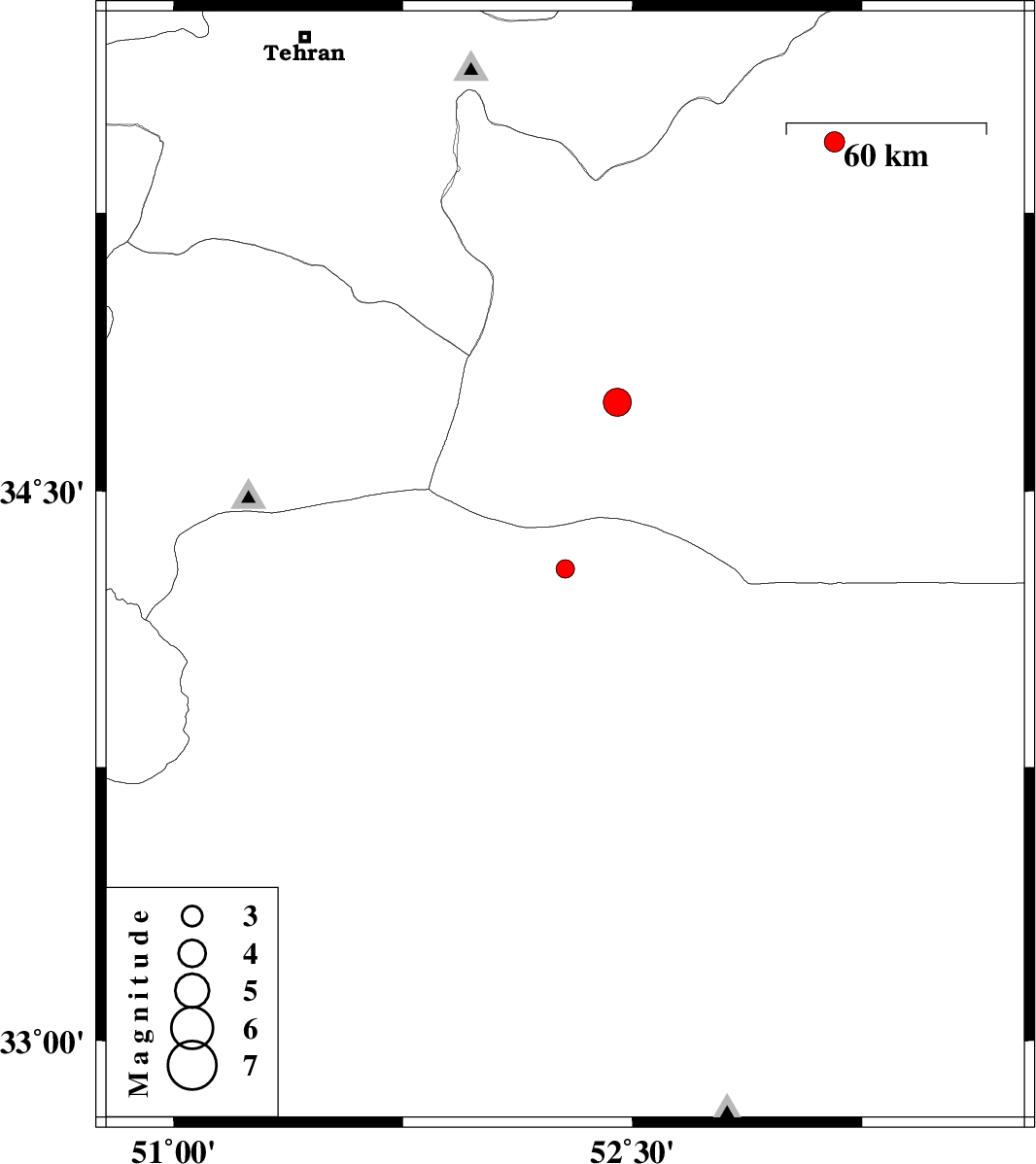 | 2011/08/28 | 14:23:16.2 | 18:53:16.2 | 34.74 | 52.45 | 14 | ML4.1 | Semnan Province, 54 km South-East of Garmsar | ||
