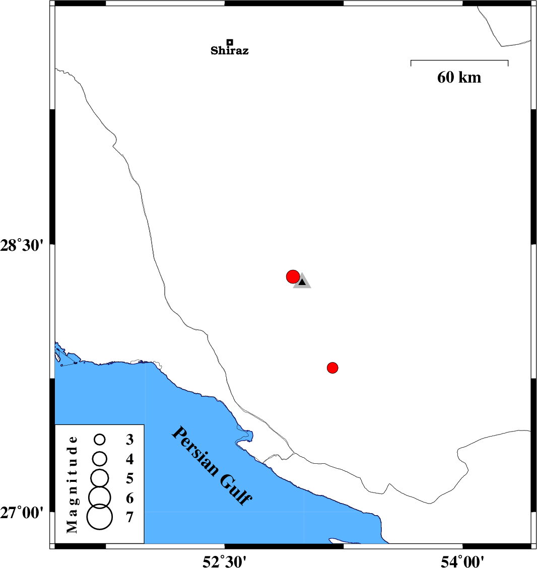 | 2011/09/17 | 23:37:29.9 | 04:07:29.9 | 28.32 | 52.93 | 6 | ML3.8 | Fars Province, 19 km South-West of Qir va Karzin | ||