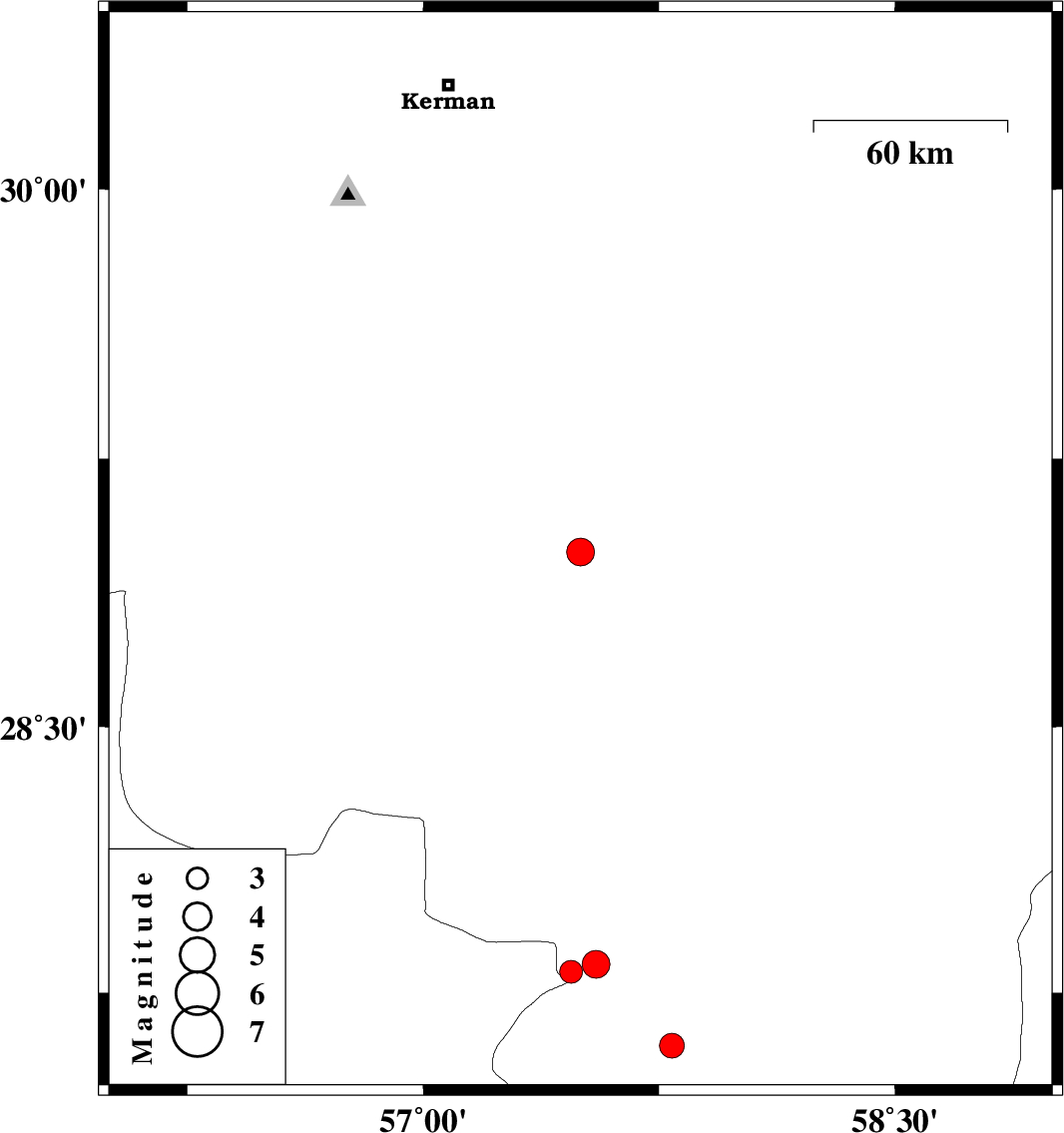 | 2011/08/21 | 01:54:46.4 | 06:24:46.4 | 27.83 | 57.55 | 31 | ML4 | Kerman Province, 19 km South-West of Kahnuj |