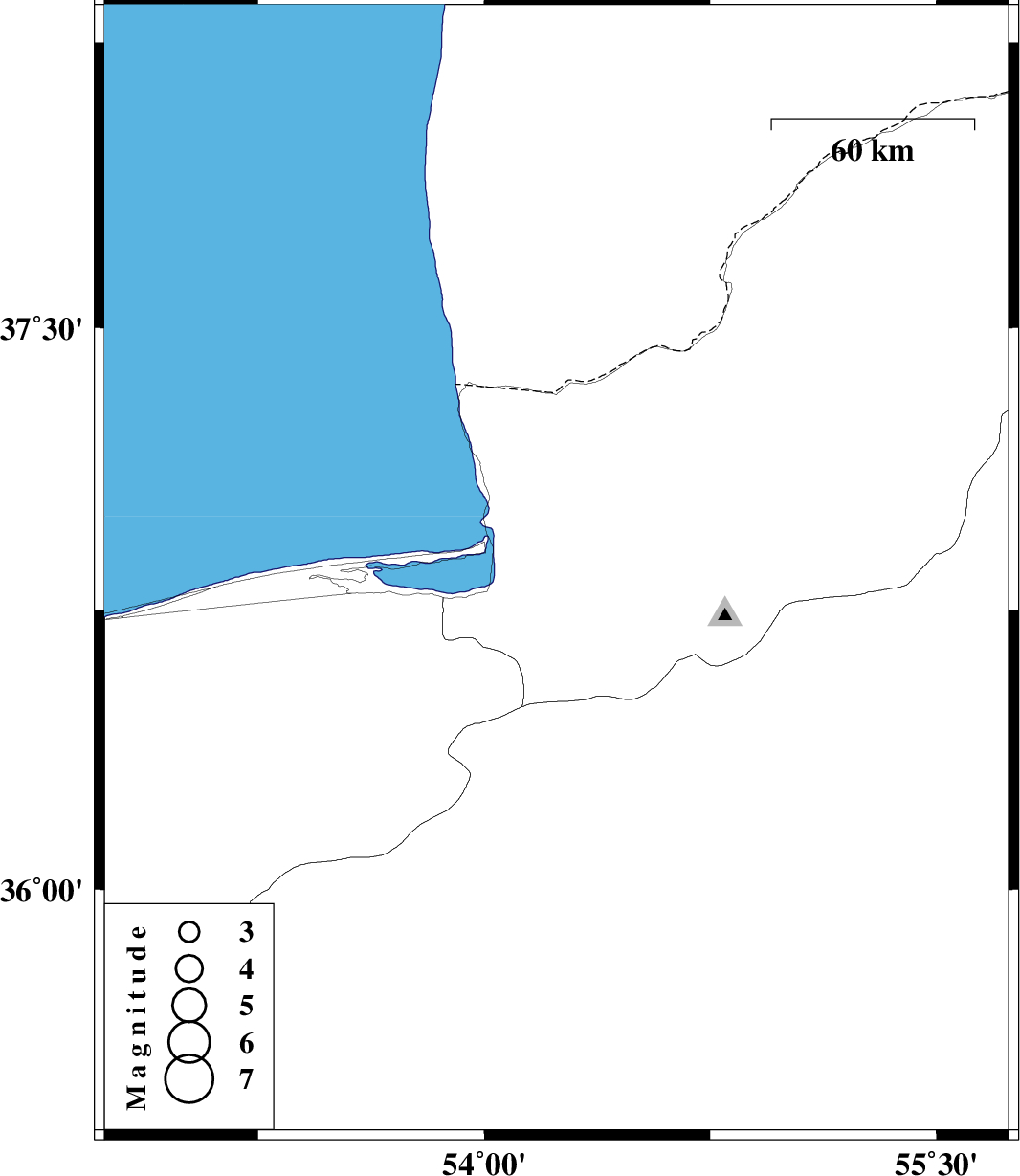 | 2011/10/02 | 02:06:45.5 | 05:36:45.5 | 36.85 | 54.24 | 15 | ML2.9 | Golestan Province, 13 km East of Kordkuy |