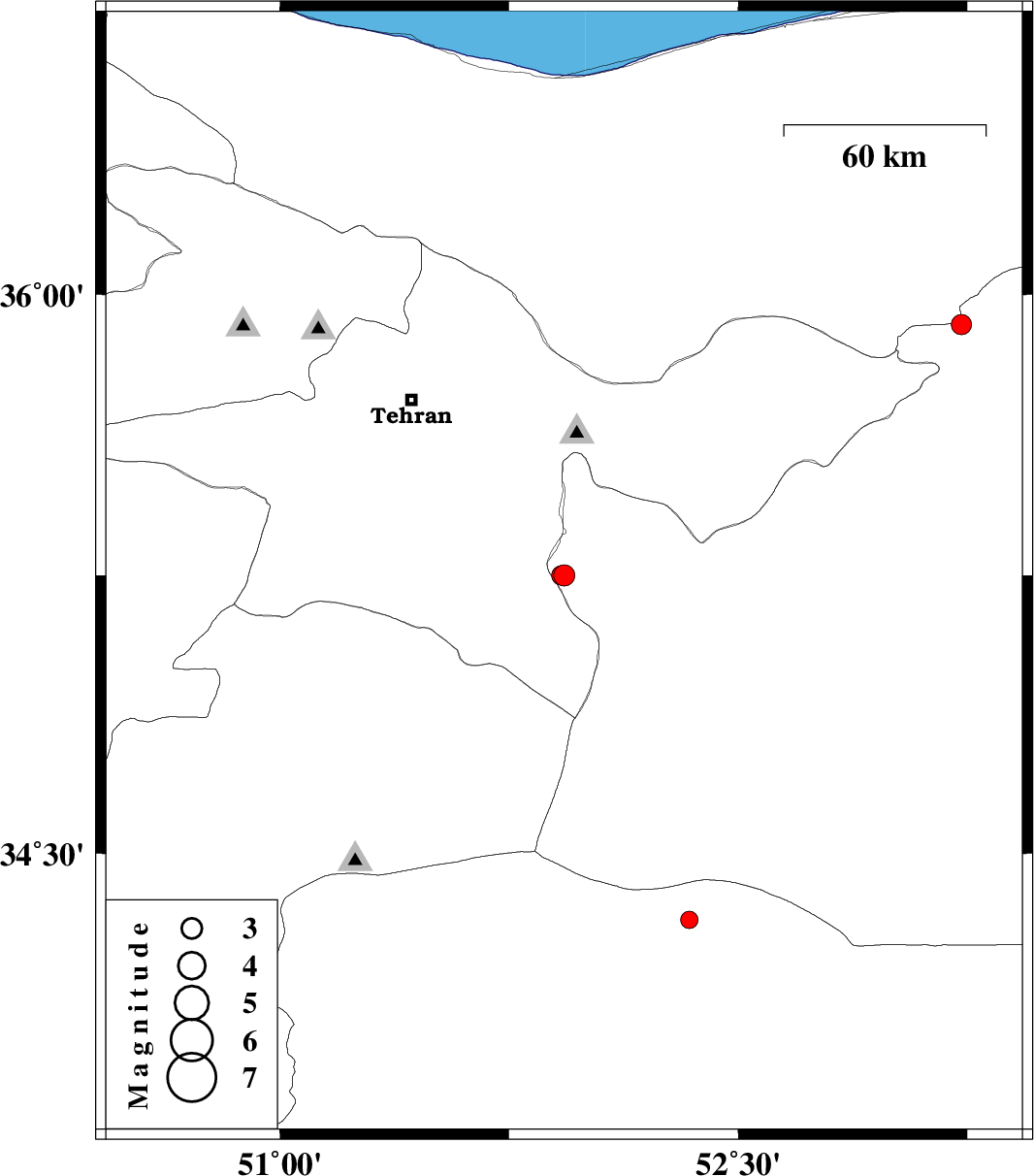 | 2011/09/30 | 03:29:57.8 | 06:59:57.8 | 34.32 | 52.34 | 14 | ML2.5 | Esfahan Province, 100 km South of Garmsar |