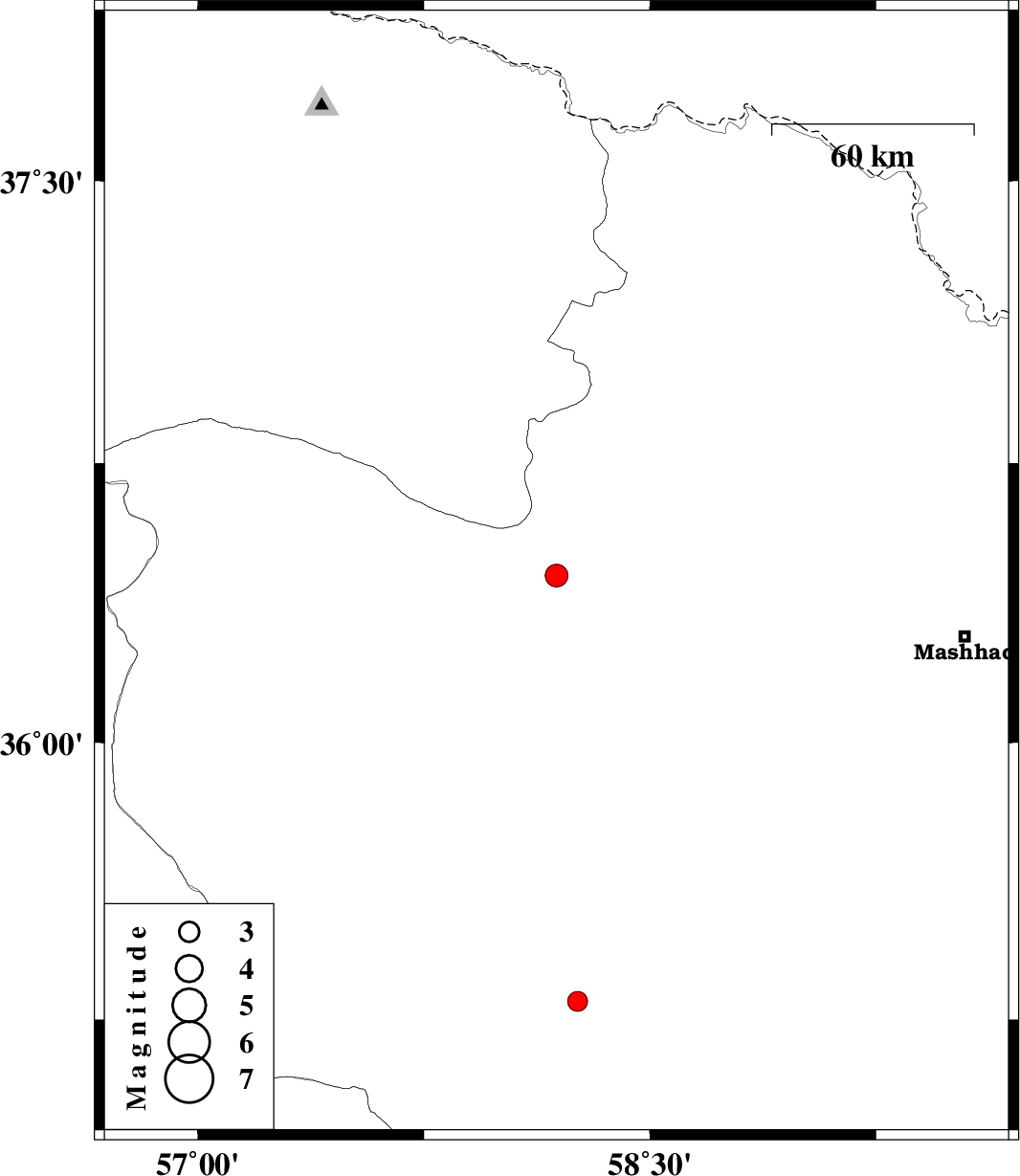 | 2011/10/11 | 07:36:40.5 | 11:06:40.5 | 35.3 | 58.26 | 15 | ML3 | Khorasan(center) Province, 20 km West of Kashmar |