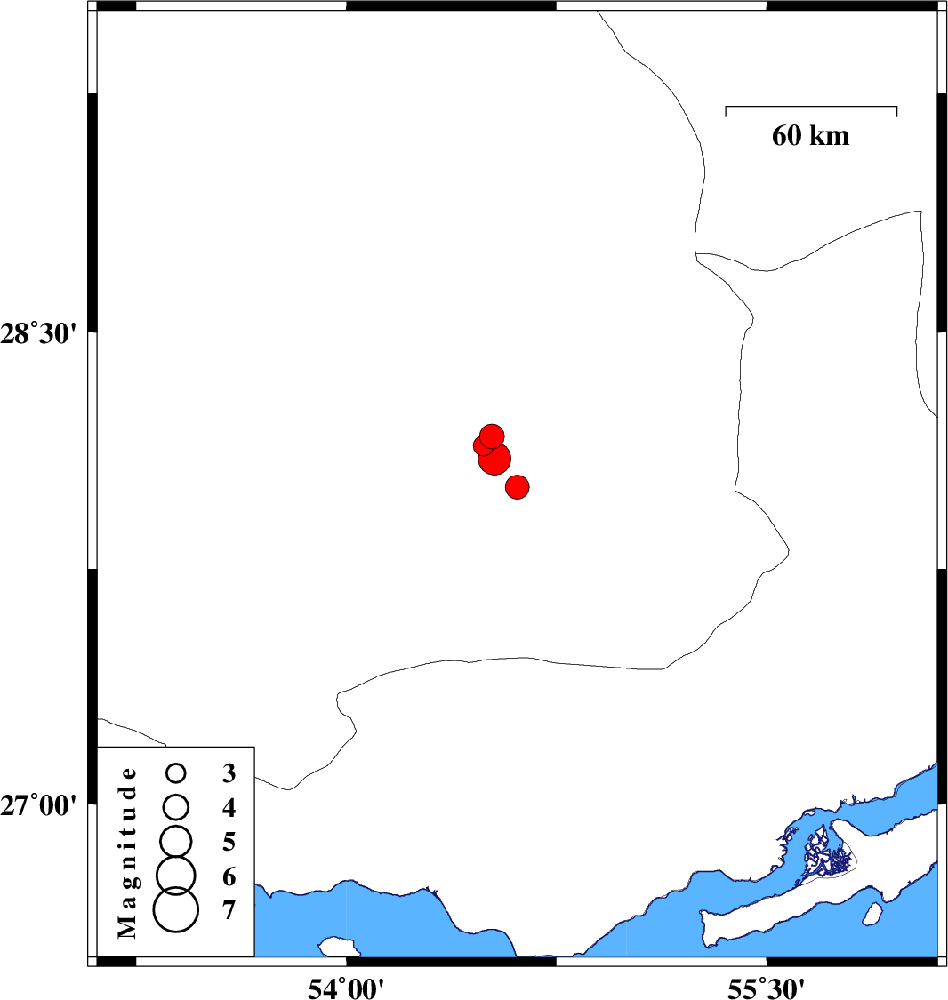 | 2011/10/19 | 02:52:40.2 | 06:22:40.2 | 28.1 | 54.53 | 18 | ML5.2 | Fars Province, 50 km North-East of Lar |
