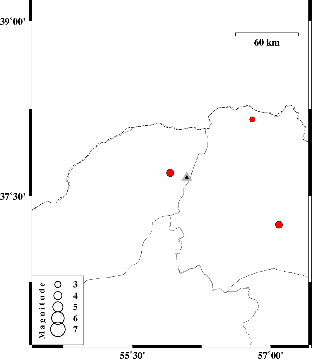 | 2011/11/08 | 20:11:13.3 | 23:41:13.3 | 37.7 | 55.91 | 14 | ML3.6 | Golestan Province, 51 km North-East of Kalaleh | ||