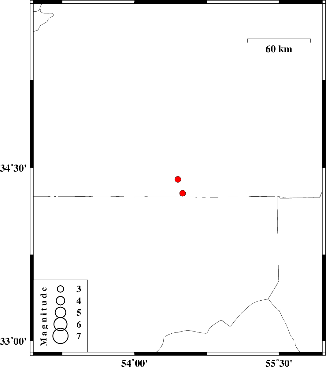| 2011/11/16 | 09:22:35.2 | 12:52:35.2 | 34.28 | 54.5 | 15 | ML2.8 | Semnan Province, 210 km South-East of Damghan |