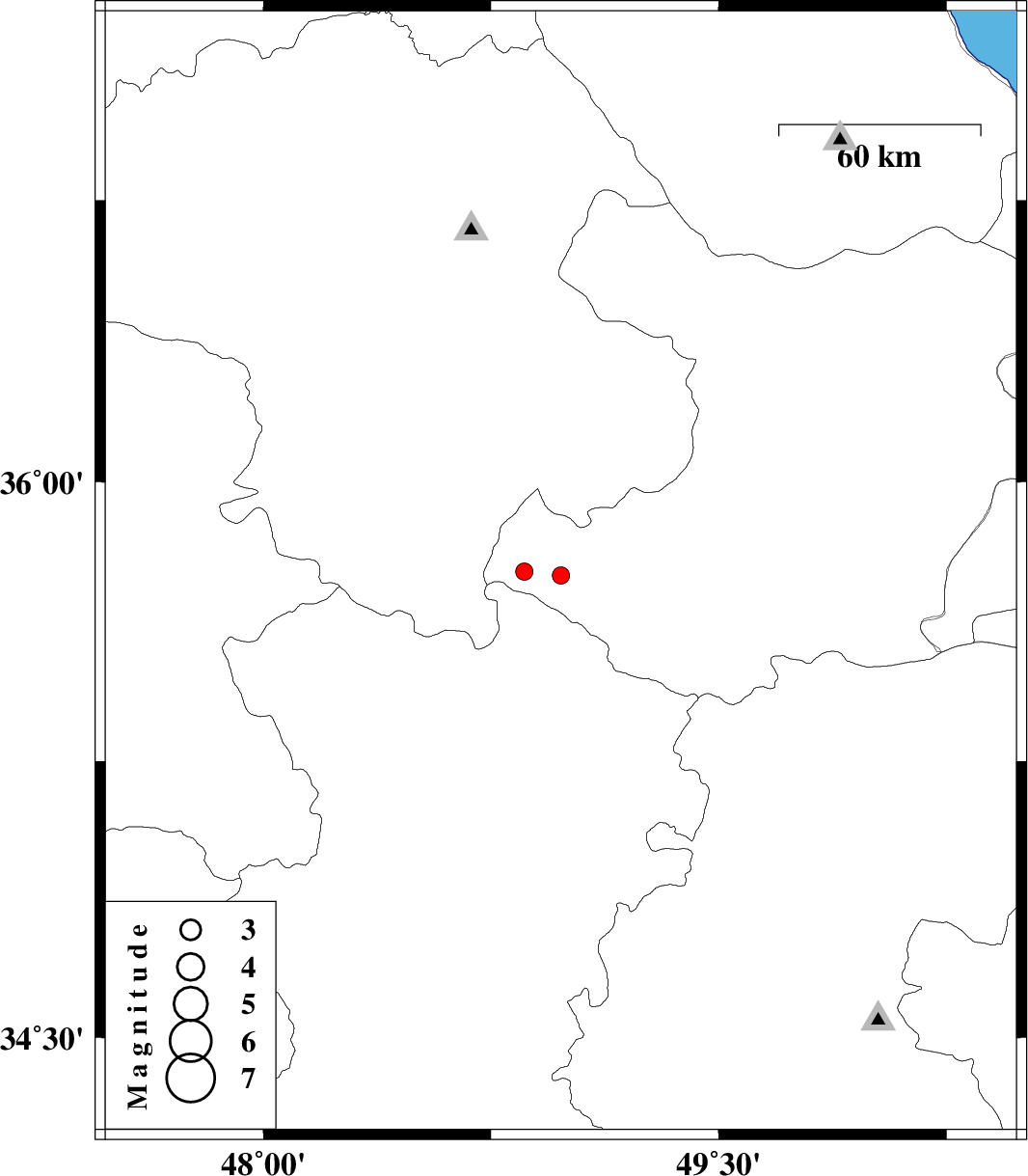 | 2011/11/22 | 01:54:24.6 | 05:24:24.6 | 35.76 | 48.86 | 14 | ML2.5 | Ghazvin Province, 45 km North-West of Razan |