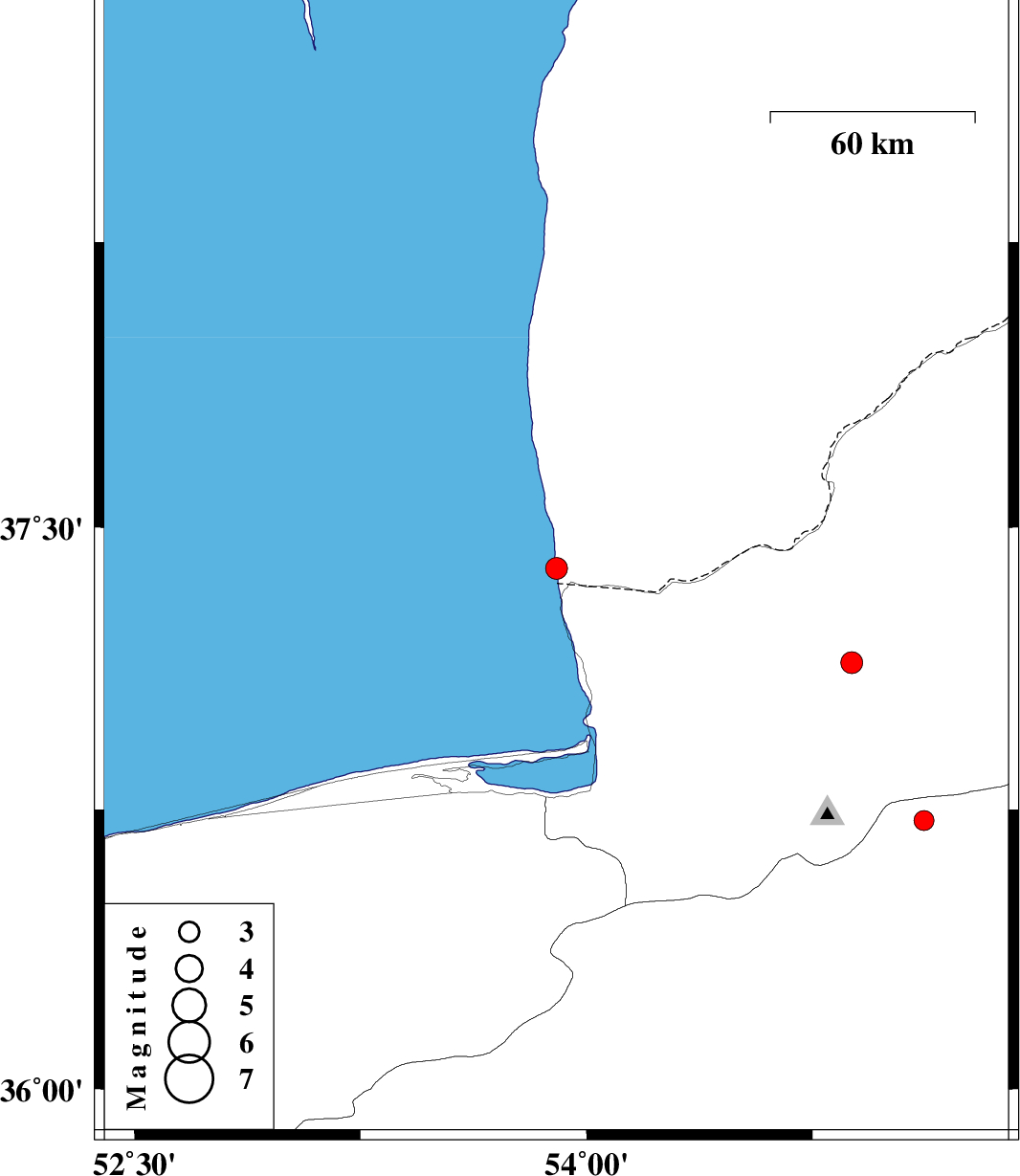 | 2011/11/26 | 12:04:55.2 | 15:34:55.2 | 37.14 | 54.88 | 27 | ML3.2 | Golestan Province, 26 km North of Ali Abad | ||