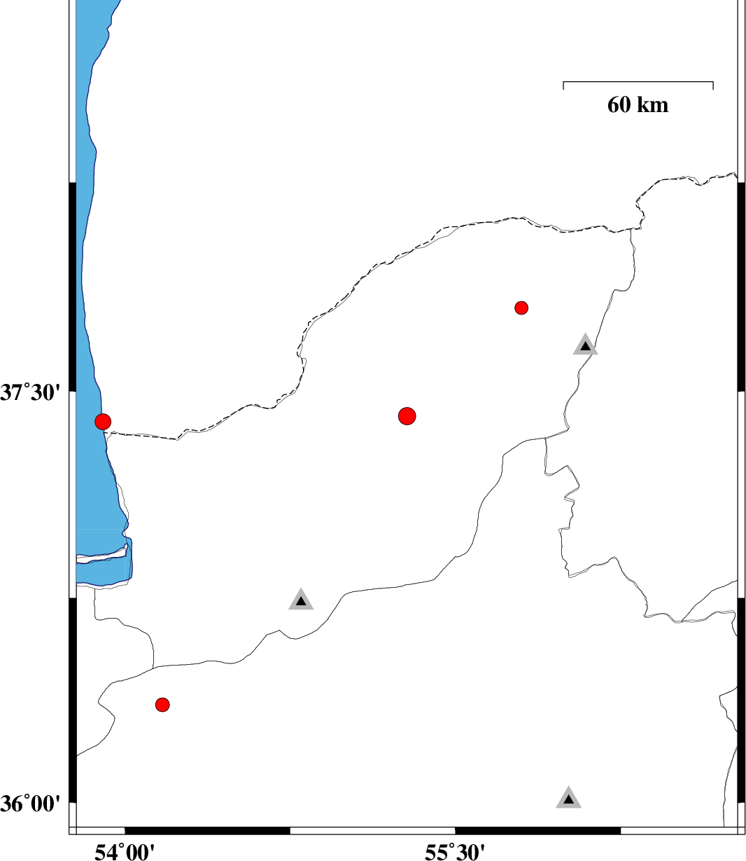 | 2011/12/01 | 03:56:42.1 | 07:26:42.1 | 37.8 | 55.8 | 6 | ML2.7 | Golestan Province, 54 km North-East of Kalaleh | ||