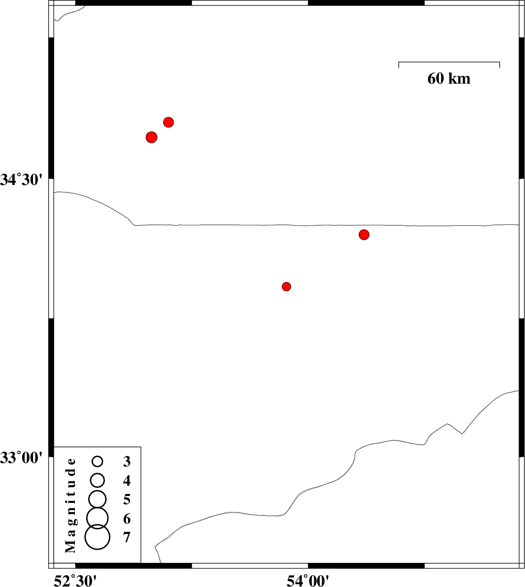 | 2011/12/09 | 01:12:50.1 | 04:42:50.1 | 34.72 | 52.99 | 14 | ML3.2 | Semnan Province, 82 km South-East of Garmsar | ||