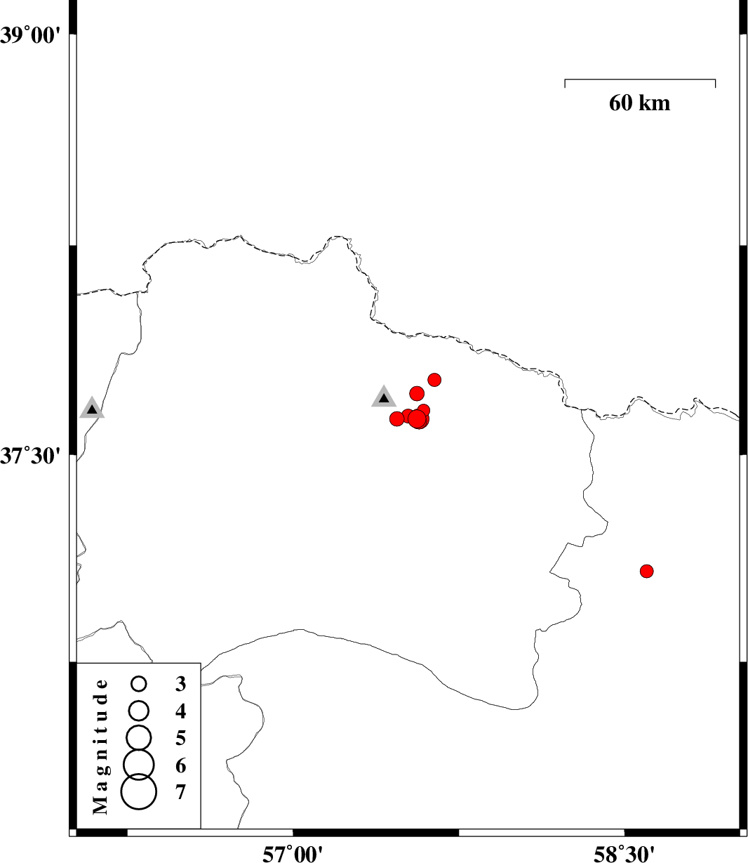 2011/12/26 04:12:00.1 07:42:00.1 37.7257.5617 ML3 Khorasan(north) Province, 34 km North-East of Bojnurd