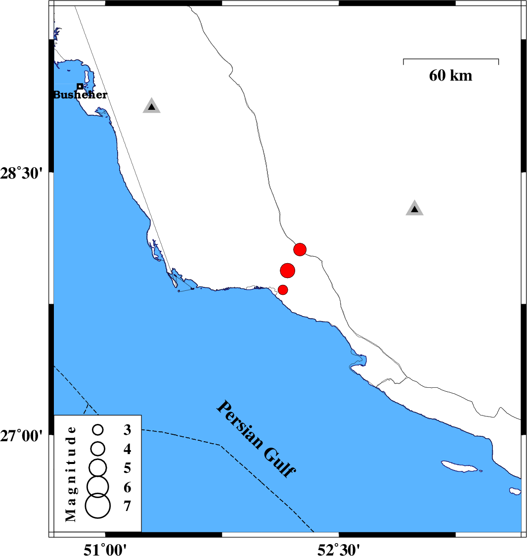 | 2012/01/05 | 17:49:11.2 | 21:19:11.2 | 28.06 | 52.25 | 42 | ML3.6 | Bushehr Province, 26 km North of Jam | ||