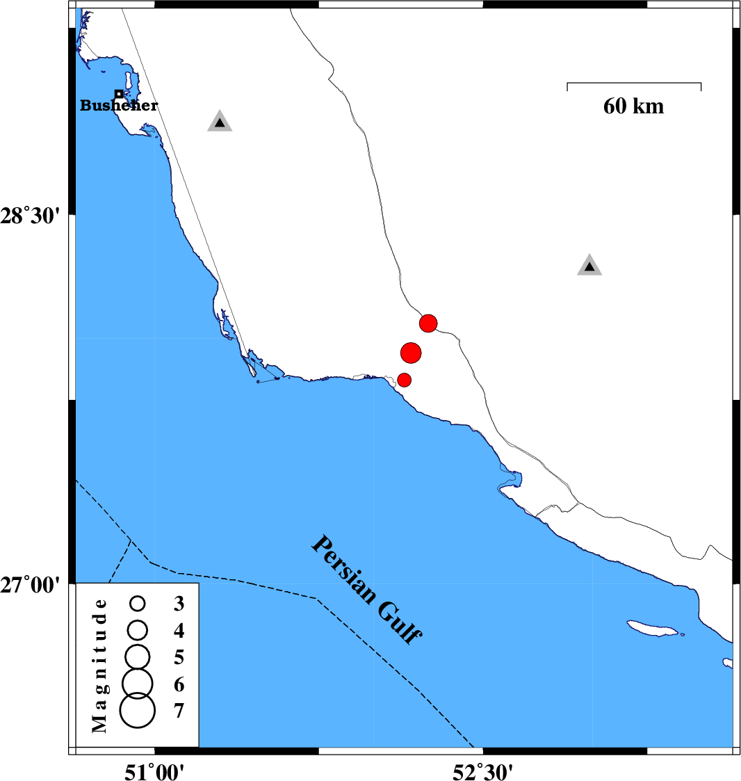 | 2012/01/05 | 17:49:11.2 | 21:19:11.2 | 28.06 | 52.25 | 42 | ML3.6 | Bushehr Province, 26 km North of Jam | ||