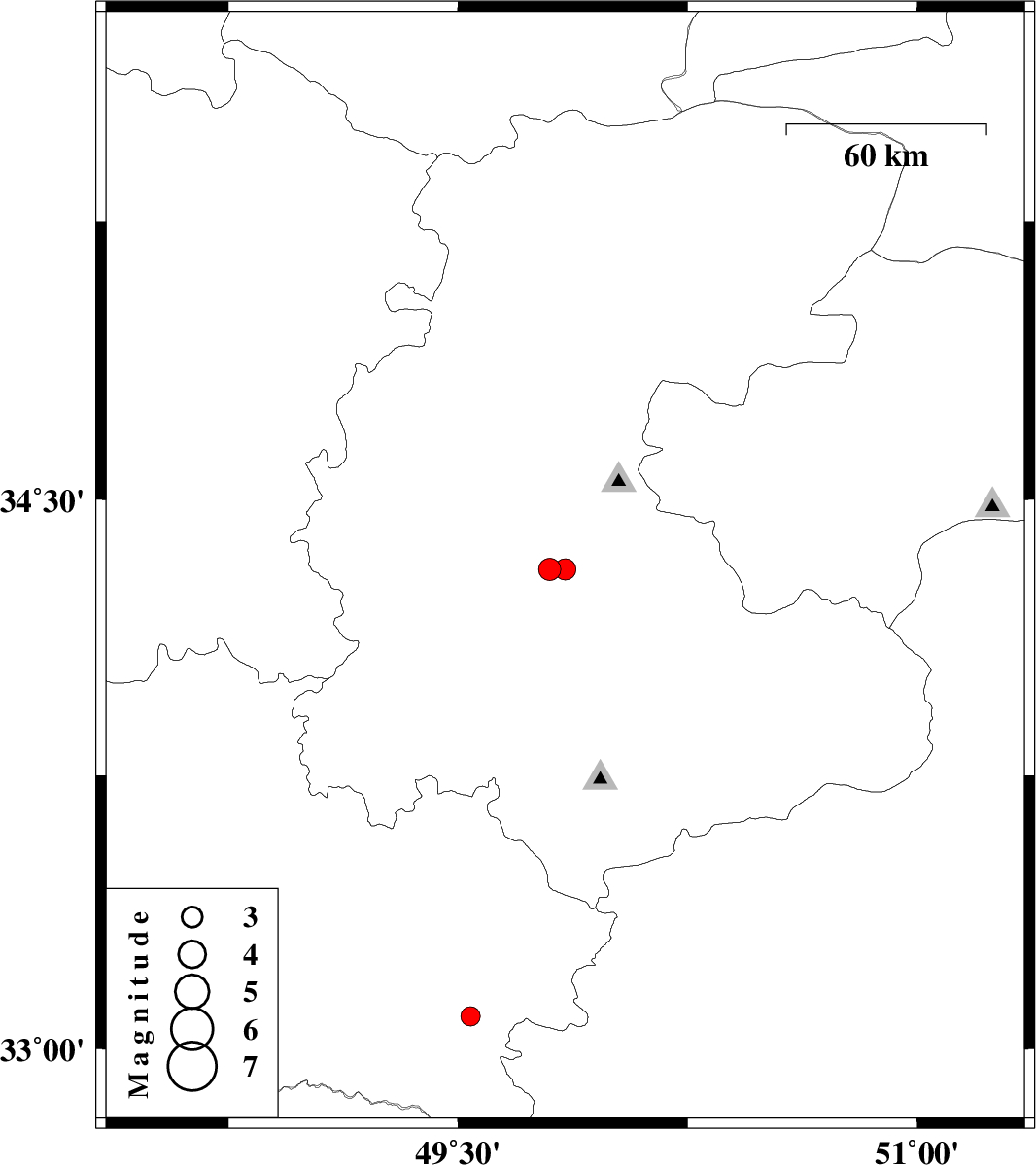 | 2012/01/14 | 09:45:11.9 | 13:15:11.9 | 33.09 | 49.54 | 15 | ML2.8 | Lorestan Province, 41 km South of Azna |