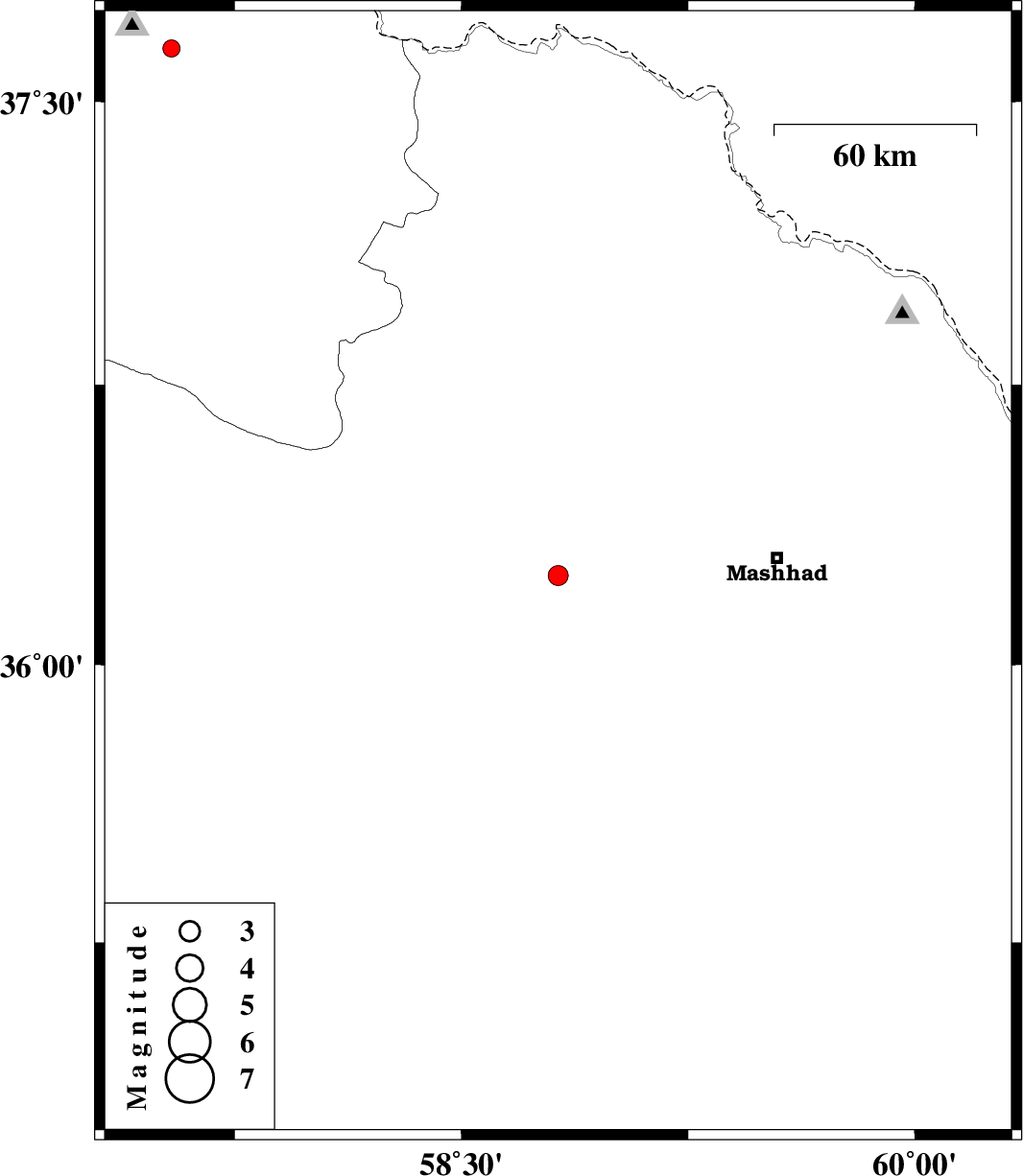 | 2012/01/08 | 08:54:42.3 | 12:24:42.3 | 37.64 | 57.54 | 14 | ML2.5 | Khorasan(north) Province, 26 km North-East of Bojnurd |