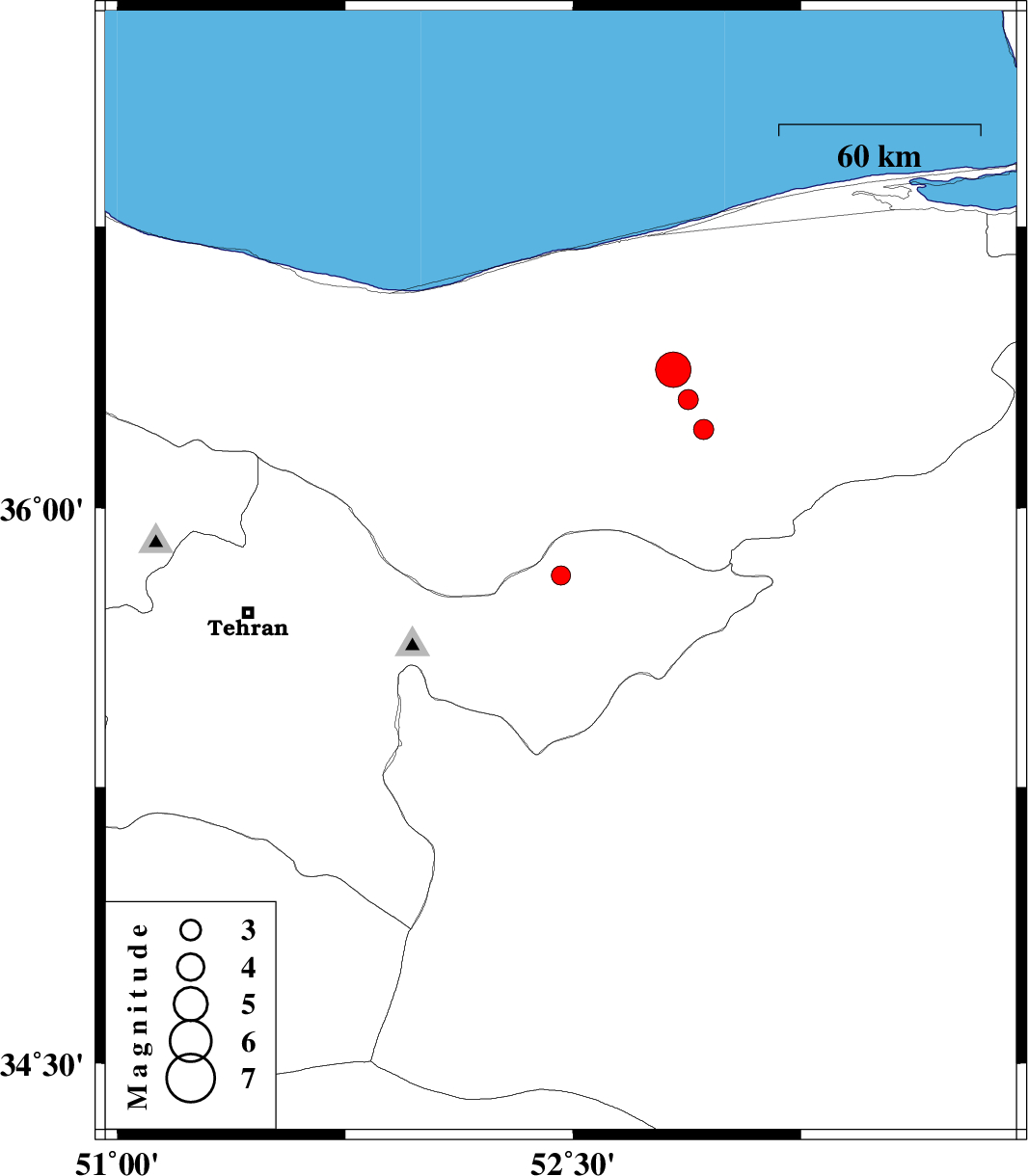 | 2012/01/16 | 11:44:02.2 | 15:14:02.2 | 35.82 | 52.46 | 6 | ML2.8 | Tehran Province, 29 km West of Firuzkuh | ||