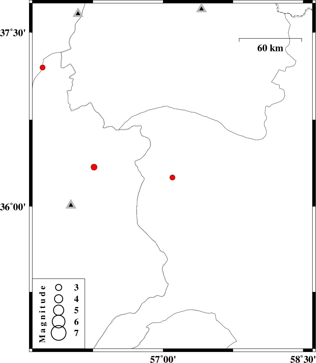 | 2012/01/17 | 09:22:17.8 | 12:52:17.8 | 36.34 | 56.26 | 16 | ML2.9 | Semnan Province, 69 km South-West of Jajarm | ||