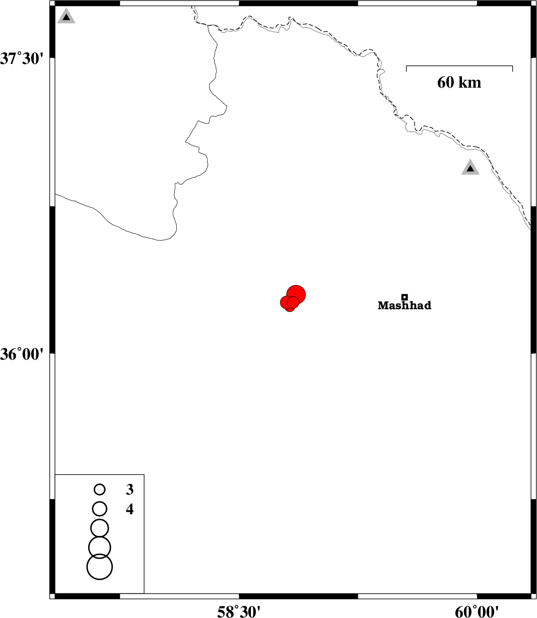 | 2012/01/15 | 21:50:34.0 | 01:20:34.0 | 36.24 | 58.82 | 18 | ML3 | Khorasan(center) Province, 4 km Neyshabur |