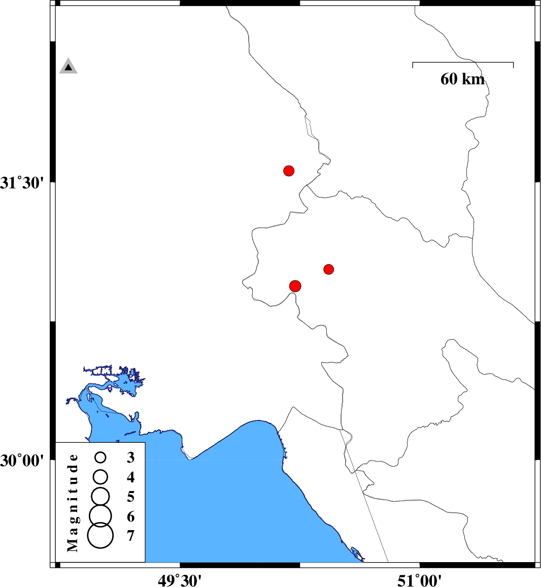 | 2012/01/04 | 03:09:11.3 | 06:39:11.3 | 31.56 | 50.18 | 15 | ML3 | Khoozestan Province, 27 km East of Bagh Malek |