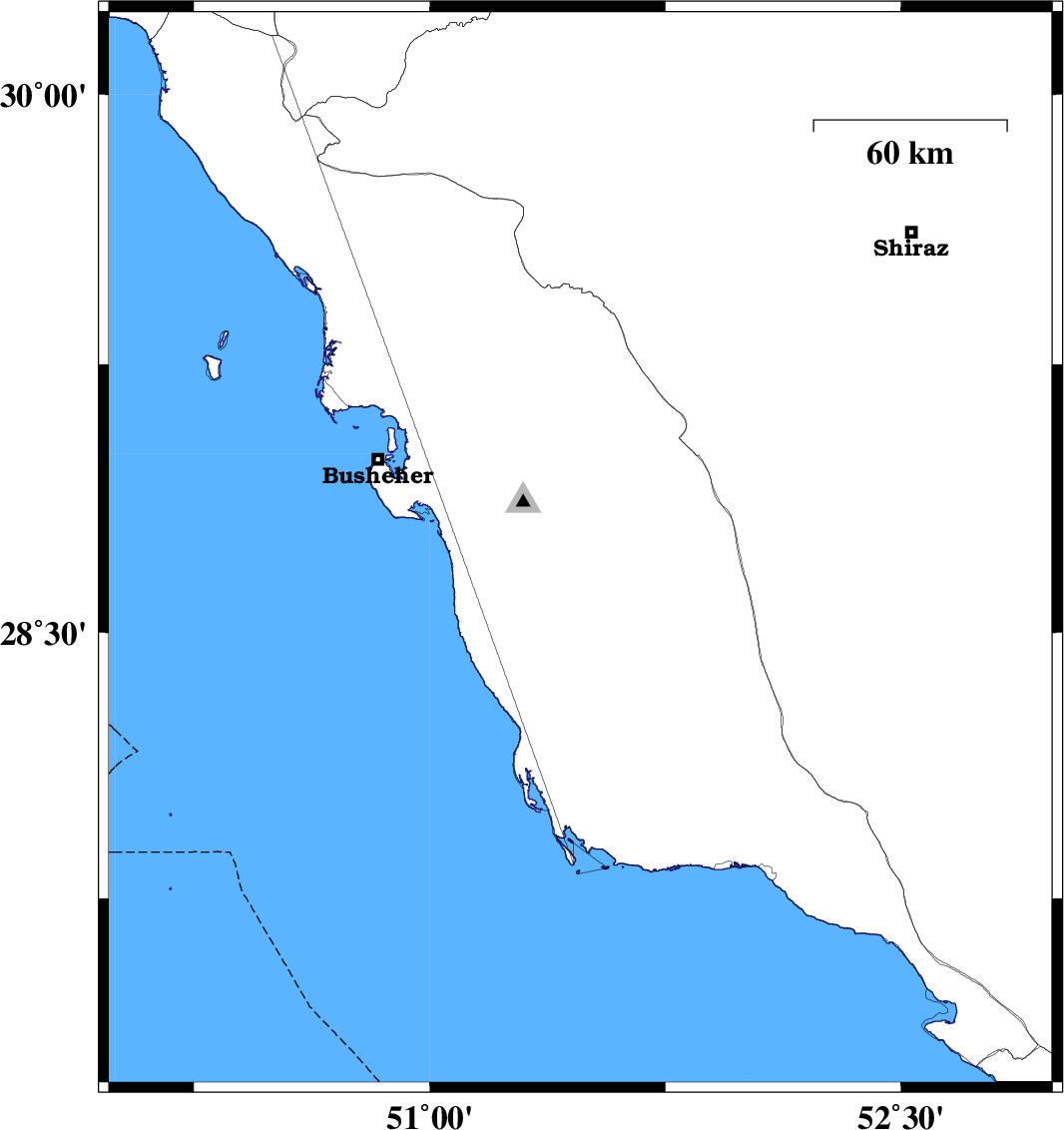 | 2012/02/05 | 06:10:40.9 | 09:40:40.9 | 28.73 | 51.48 | 14 | ML4.7 | Bushehr Province, 14 km East of Khormog |