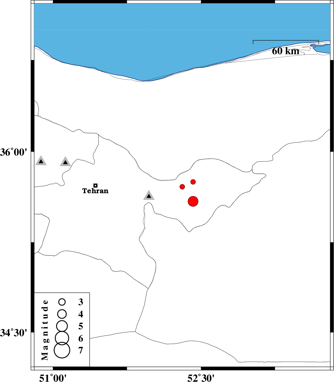 | 2012/02/10 | 08:59:40.0 | 12:29:40.0 | 35.59 | 52.42 | 14 | ML4.6 | Tehran Province, 42 km North of Garmsar | download | |