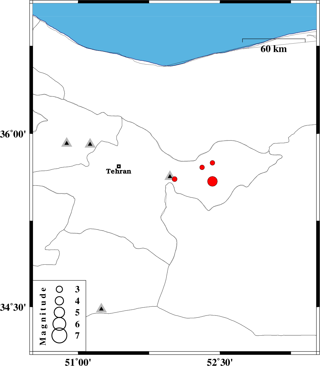 | 2012/02/10 | 11:42:58.4 | 15:12:58.4 | 35.71 | 52.31 | 18 | ML2.3 | Tehran Province, 21 km East of Damavand | ||