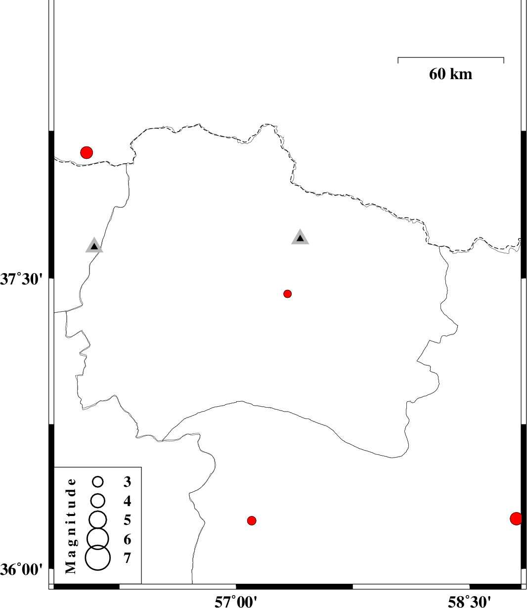 | 2012/02/18 | 07:20:26.8 | 10:50:26.8 | 37.42 | 57.33 | 14 | ML2.2 | Khorasan(north) Province, 6 km Bojnurd | ||
