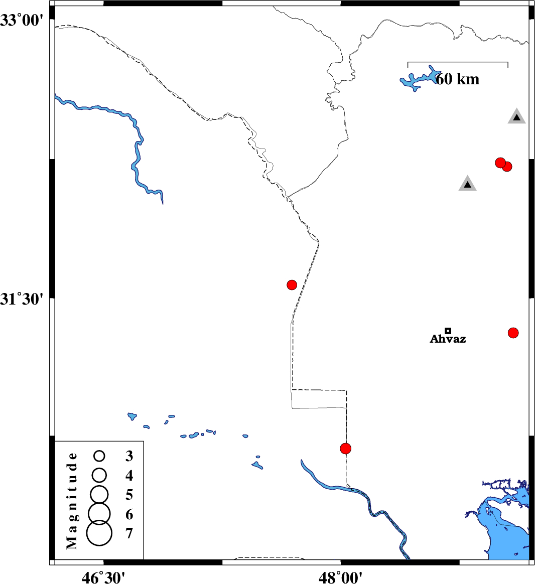 | 2012/02/11 | 01:23:30.2 | 04:53:30.2 | 32.23 | 49.01 | 16 | ML3 | Khoozestan Province, 20 km South of Lali | ||