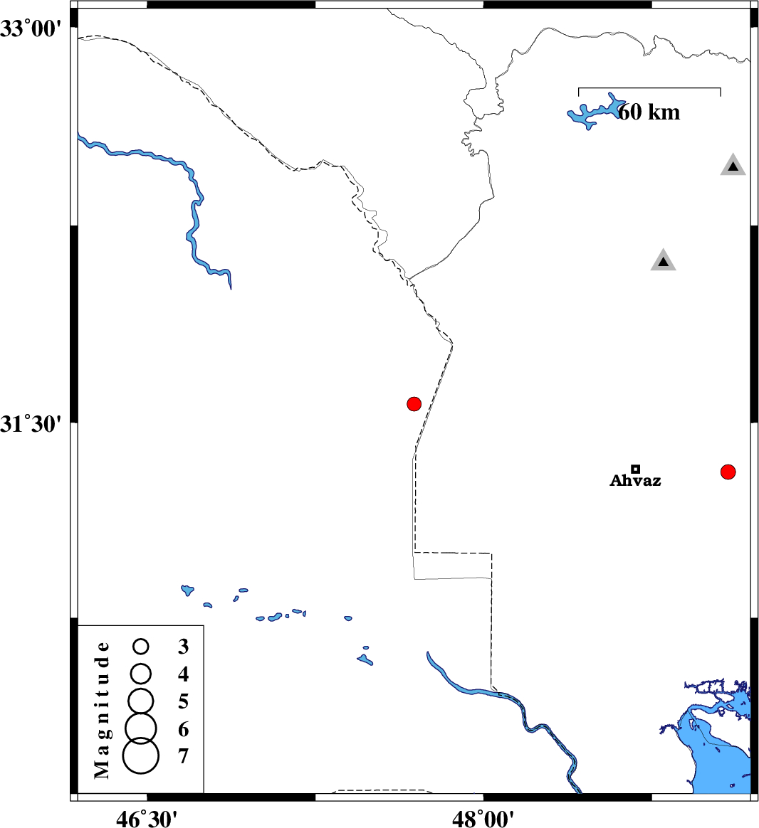 | 2012/02/21 | 19:44:09.0 | 23:14:09.0 | 31.31 | 49.09 | 23 | ML2.9 | Khoozestan Province, 40 km East of Ahvaz |