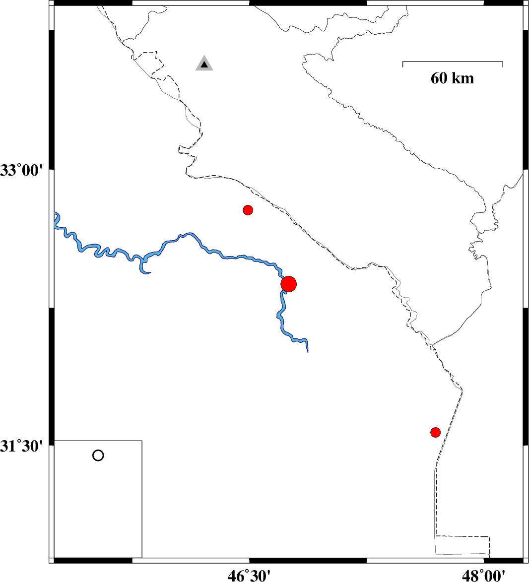 | 2012/02/28 | 23:18:49.5 | 02:48:49.5 | 32.38 | 46.75 | 15 | ML4.5 | Iraq, 59 km South-West of Dehloran | ||