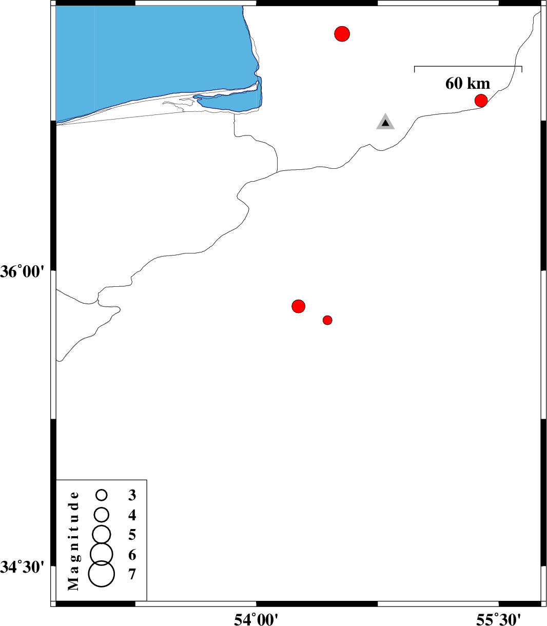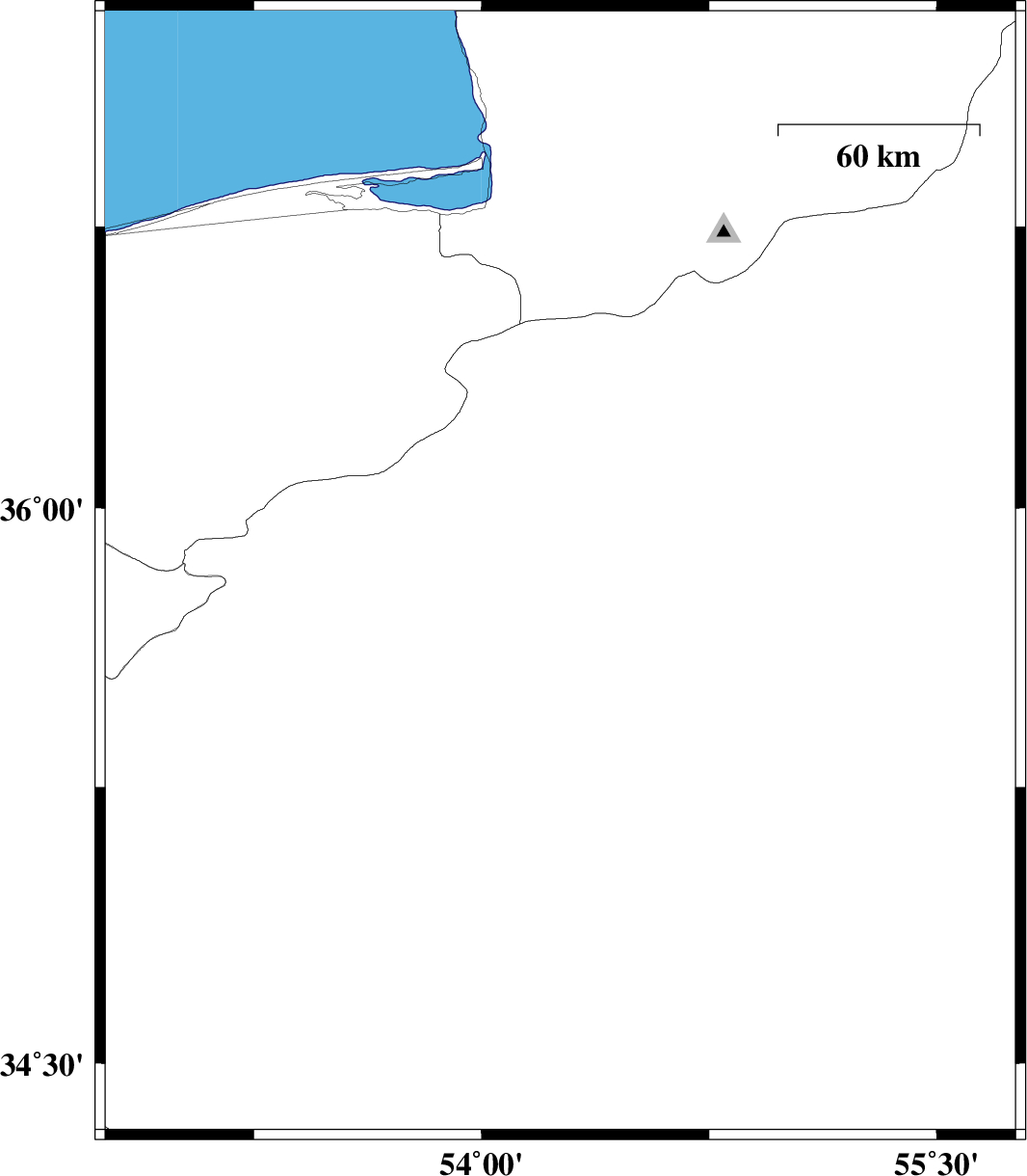 | 2012/02/13 | 15:09:44.6 | 18:39:44.6 | 36.85 | 55.39 | 14 | ML3.5 | Golestan Province, 42 km South of Minodasht |