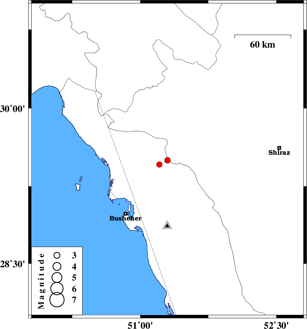 | 2012/03/06 | 20:09:54.8 | 23:39:54.8 | 29.46 | 51.21 | 45 | ML2.8 | Bushehr Province, 22 km North of Borazjan | ||