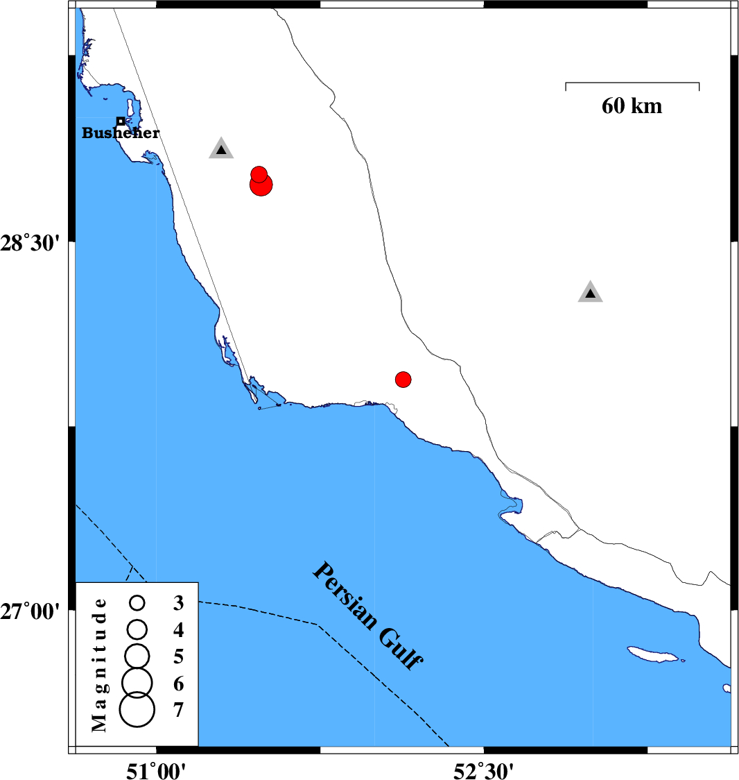 | 2012/02/05 | 06:10:40.9 | 09:40:40.9 | 28.73 | 51.48 | 14 | ML4.7 | Bushehr Province, 14 km East of Khormog |