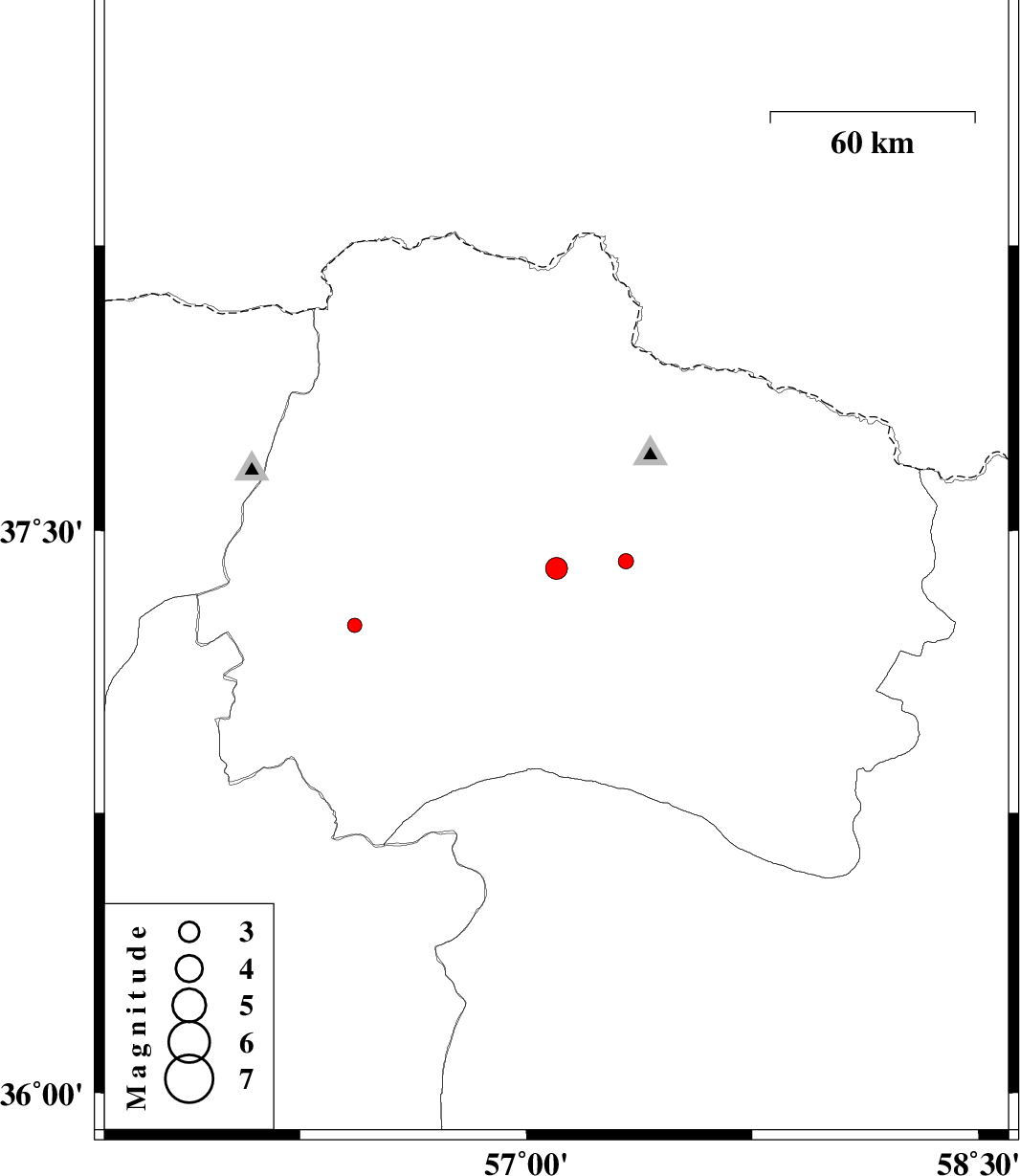 | 2012/02/18 | 07:20:26.8 | 10:50:26.8 | 37.42 | 57.33 | 14 | ML2.2 | Khorasan(north) Province, 6 km Bojnurd |