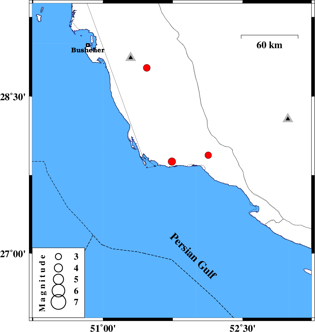 | 2012/03/13 | 00:30:26.1 | 04:00:26.1 | 27.88 | 51.74 | 29 | ML3.6 | Bushehr Province, 32 km West of Bandar-e kangan | ||