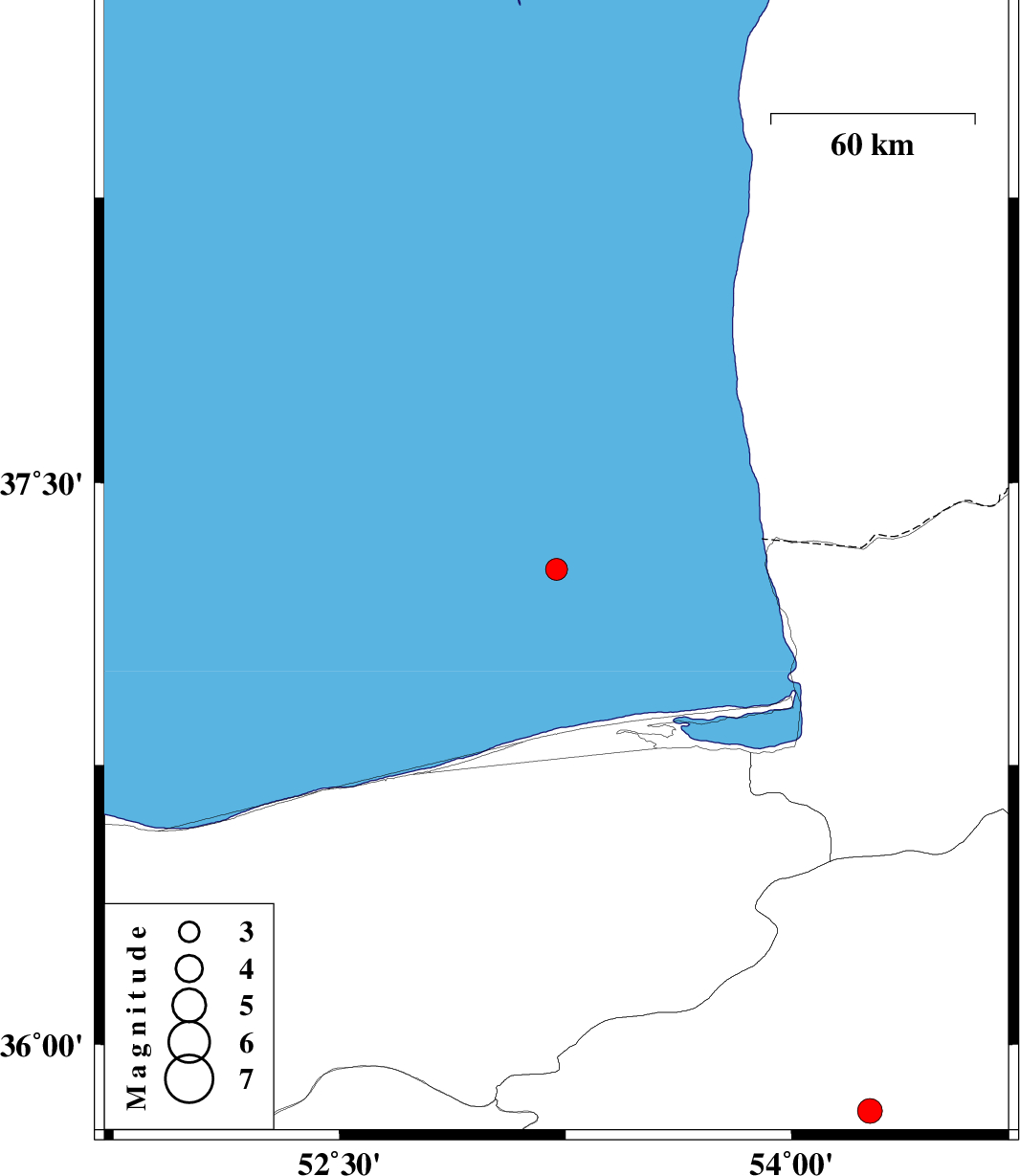 | 2012/03/13 | 04:45:37.8 | 08:15:37.8 | 37.27 | 53.22 | 14 | ML3.3 | Caspian Sea, 70 km North of Neka | ||
