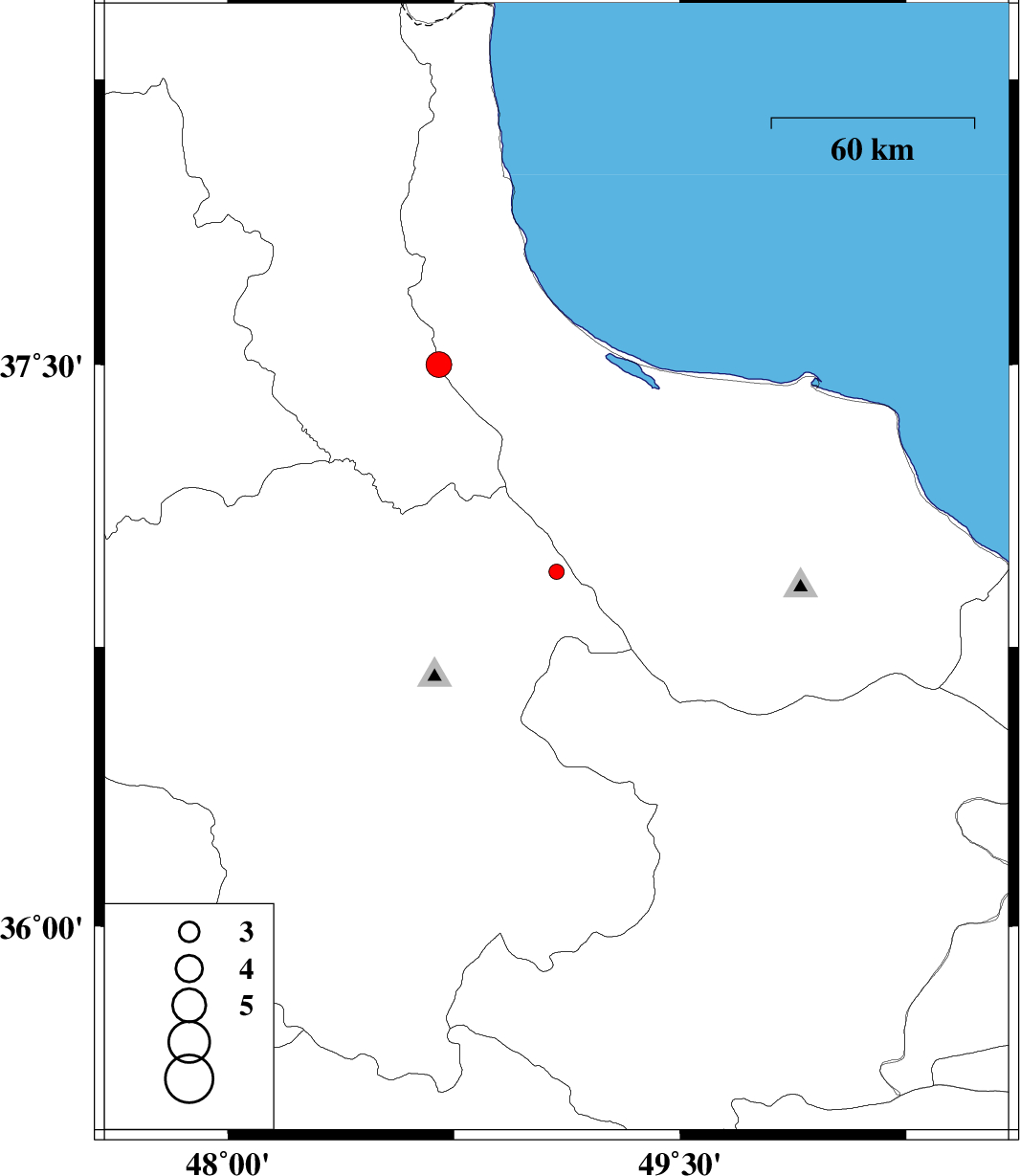 | 2012/03/11 | 03:28:51.3 | 06:58:51.3 | 37.5 | 48.7 | 14 | ML3.8 | Gilan Province, 20 km South-East of Khalkhal |