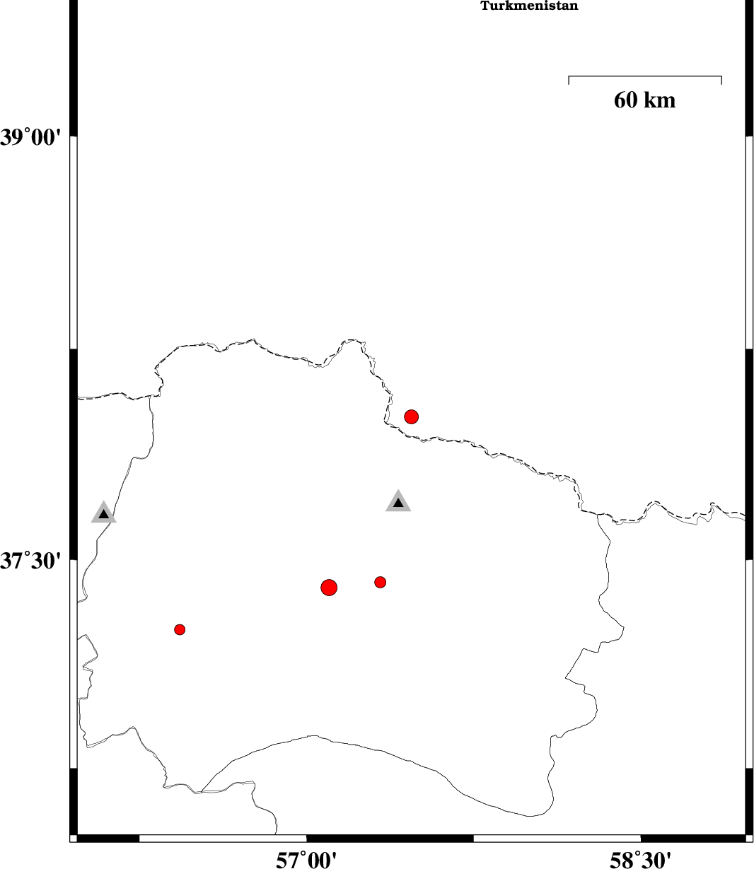 | 2012/02/18 | 07:20:26.8 | 10:50:26.8 | 37.42 | 57.33 | 14 | ML2.2 | Khorasan(north) Province, 6 km Bojnurd |