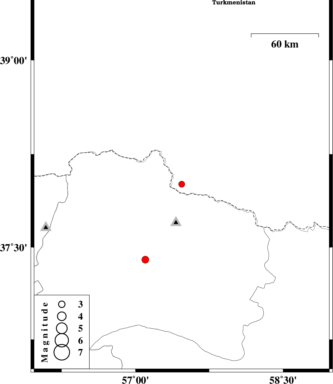 | 2012/03/10 | 15:54:28.6 | 19:24:28.6 | 37.4 | 57.1 | 15 | ML3.2 | Khorasan(north) Province, 22 km West of Bojnurd |