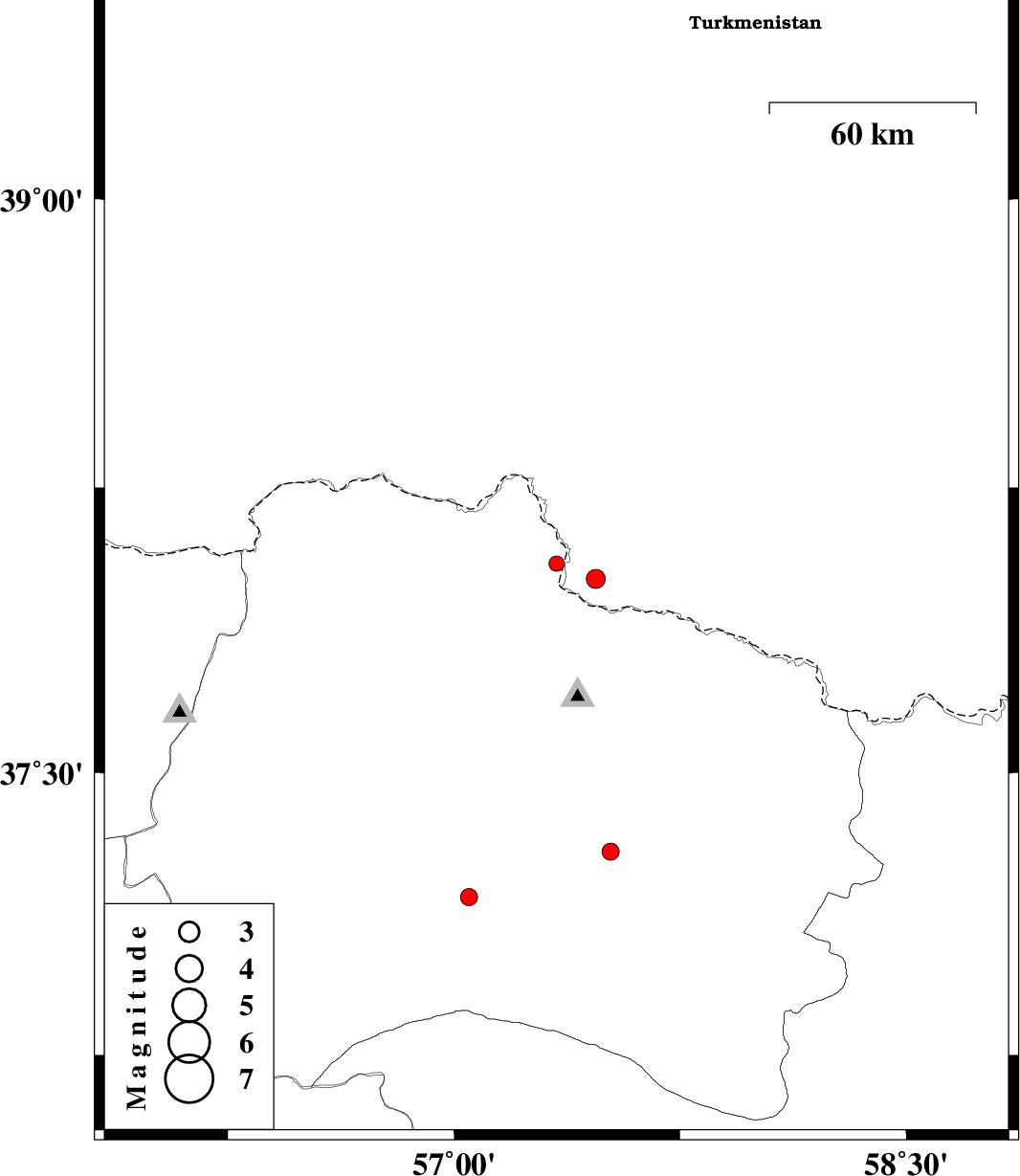 | 2012/03/16 | 23:01:24.8 | 02:31:24.8 | 38.01 | 57.47 | 14 | ML2.8 | 61 km North-East of Bojnurd |
