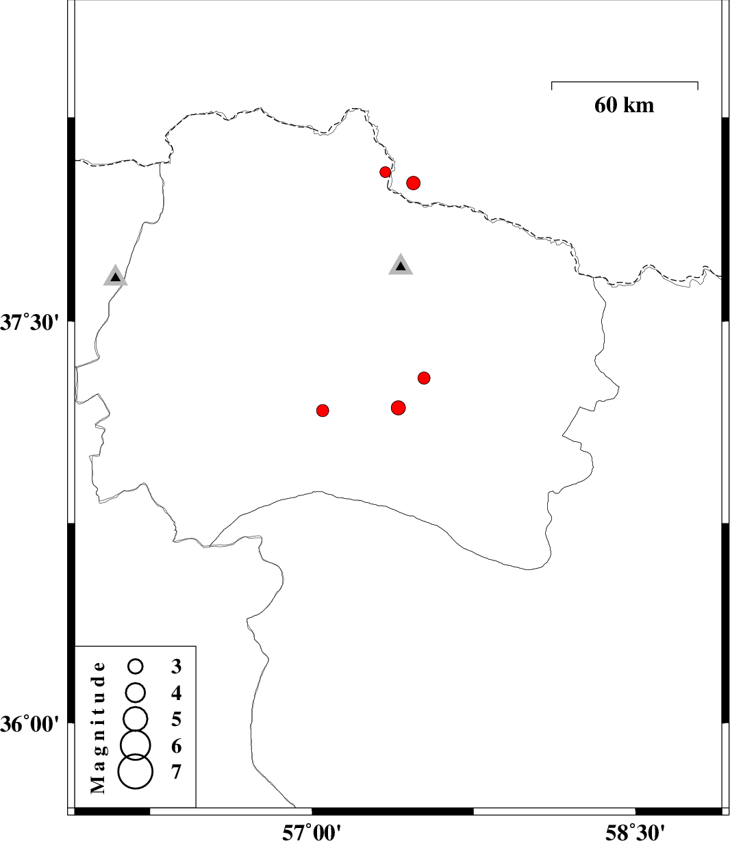 | 2012/03/16 | 23:01:24.8 | 02:31:24.8 | 38.01 | 57.47 | 14 | ML2.8 | 61 km North-East of Bojnurd |