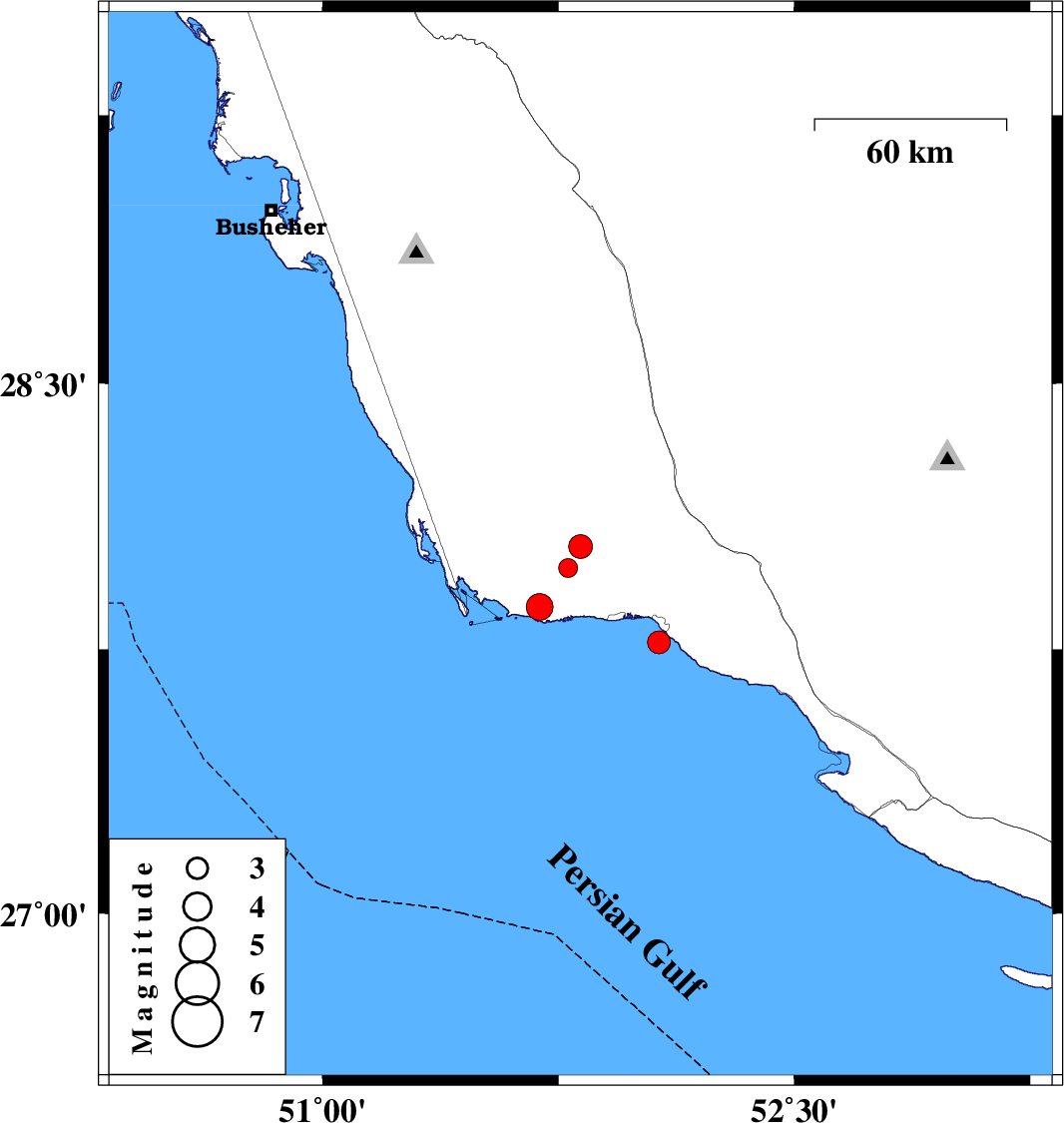 | 2012/03/17 | 02:32:13.8 | 06:02:13.8 | 27.77 | 52.07 | 43 | ML3.2 | Persian Gulf, 6 km Bandar-e kangan |