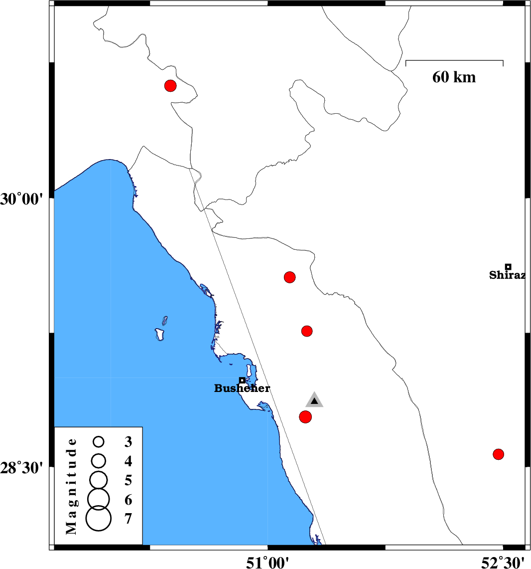 | 2012/03/25 | 12:15:00.1 | 16:45:00.1 | 28.78 | 51.24 | 11 | ML3.5 | Bushehr Province, 11 km Ahram |