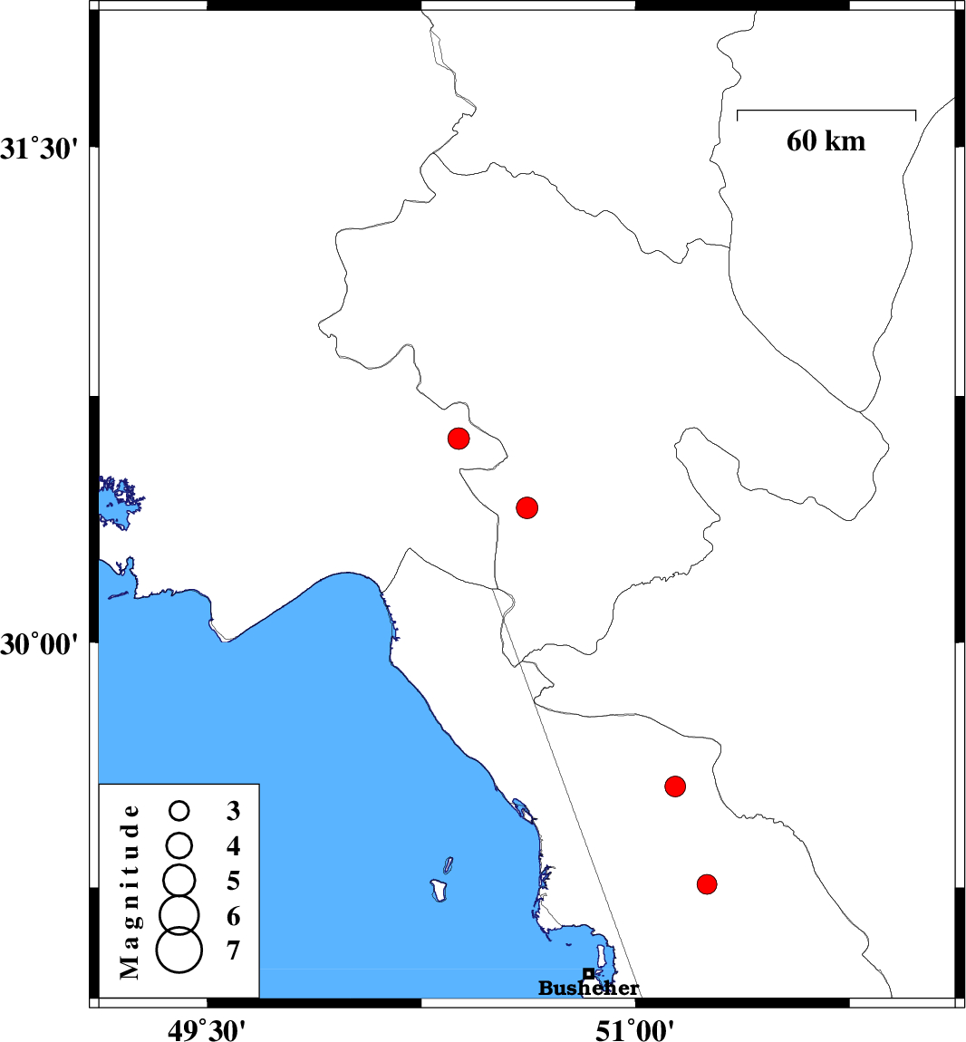 | 2012/03/29 | 04:30:55.5 | 09:00:55.5 | 29.56 | 51.14 | 14 | ML3.2 | Bushehr Province, 34 km North of Borazjan | ||