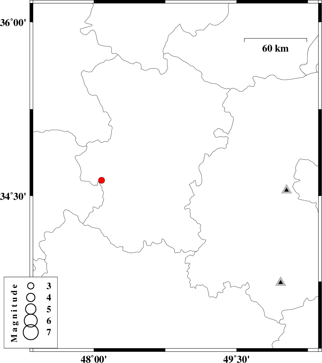| 2012/04/22 | 08:19:04.8 | 12:49:04.8 | 34.21 | 48.09 | 27 | ML2.9 | Hamedan Province, 19 km North-East of Nurabad | ||