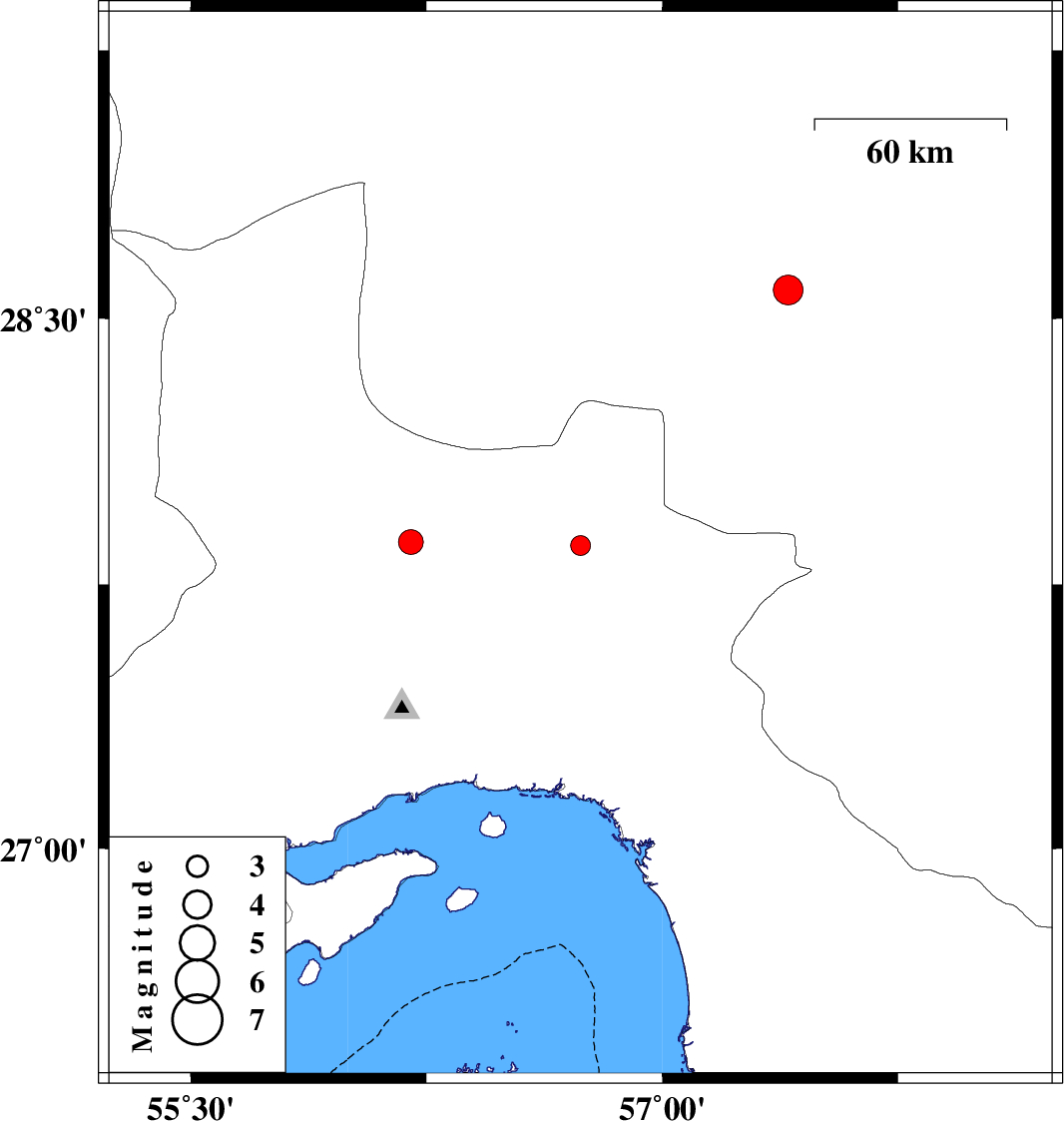 | 2012/04/29 | 11:58:38.4 | 16:28:38.4 | 28.58 | 57.4 | 31 | ML4.2 | Kerman Province, 35 km West of Jiroft |