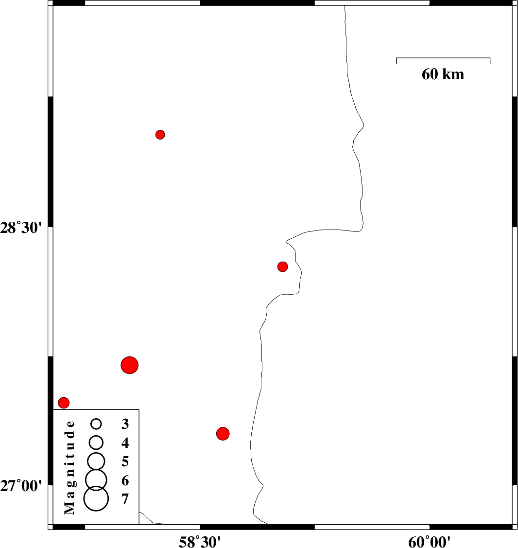 | 2012/04/18 | 17:40:36.2 | 22:10:36.2 | 27.7 | 58.04 | 15 | ML5.1 | Kerman Province, 44 km South-East of Kahnuj |