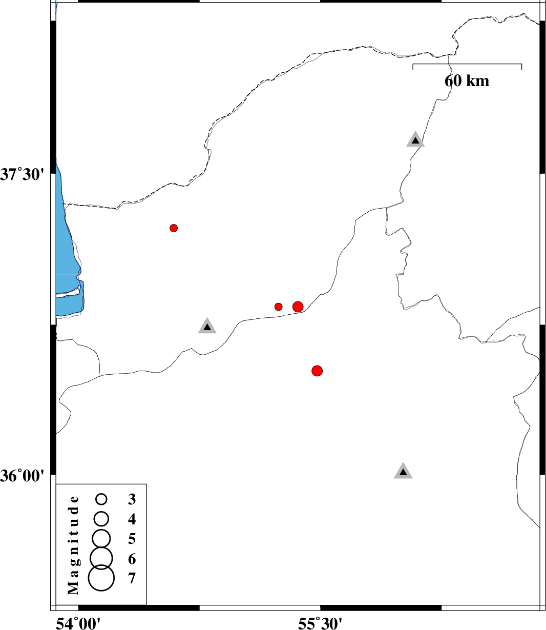 | 2012/05/10 | 04:21:42.5 | 08:51:42.5 | 36.84 | 55.24 | 14 | ML2.1 | Golestan Province, 21 km South of Ramian |