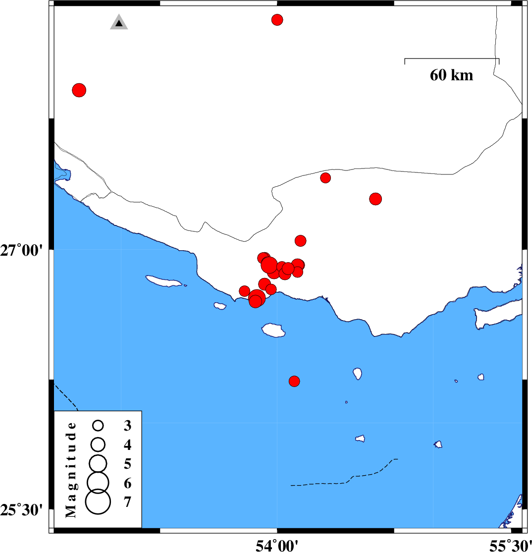 2012/05/17 19:32:11.5 00:02:11.5 26.8753.9833 ML4 Hormozgan Province, 53 km South-West of Bastak