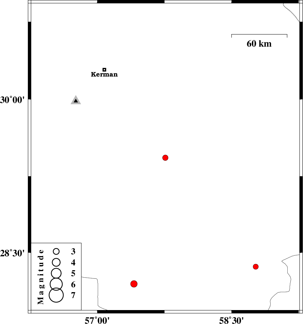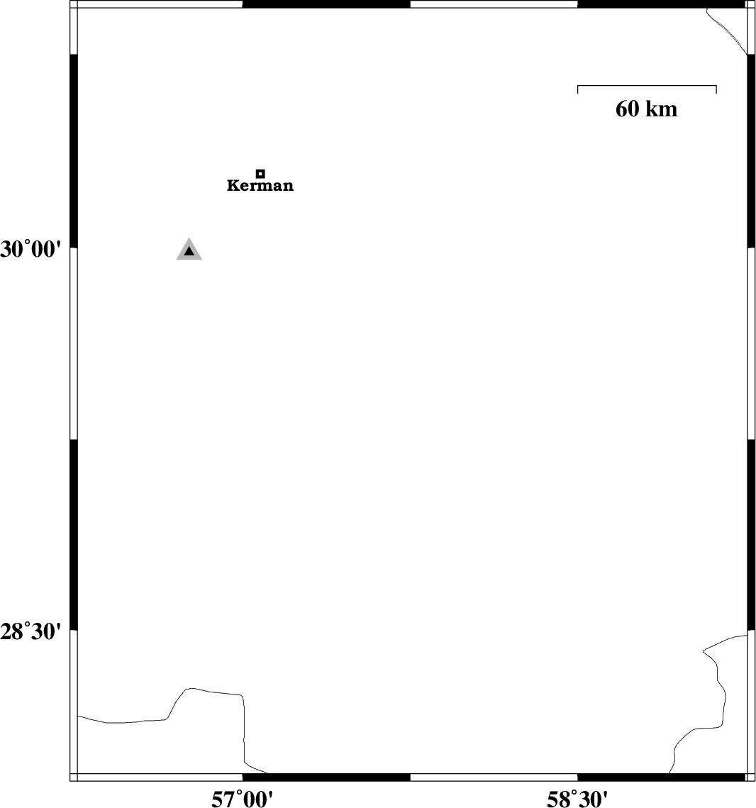 | 2012/05/28 | 10:12:01.8 | 14:42:01.8 | 28.36 | 58.77 | 14 | ML2.7 | Kerman Province, 92 km South-East of Bam |