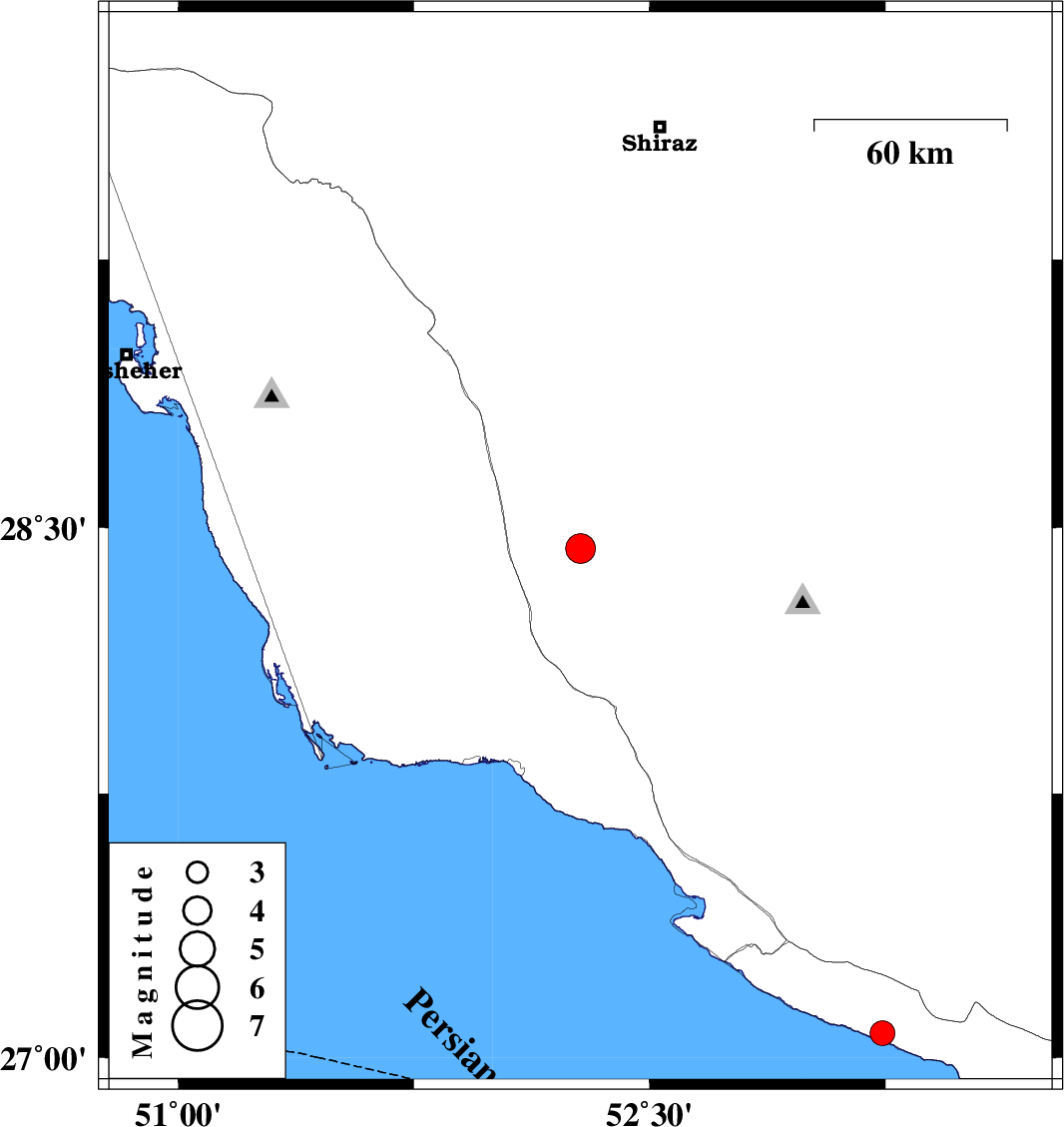 | 2012/05/26 | 09:43:06.2 | 14:13:06.2 | 27.07 | 53.24 | 14 | ML3.5 | Hormozgan Province, 31 km South of Lamerd |